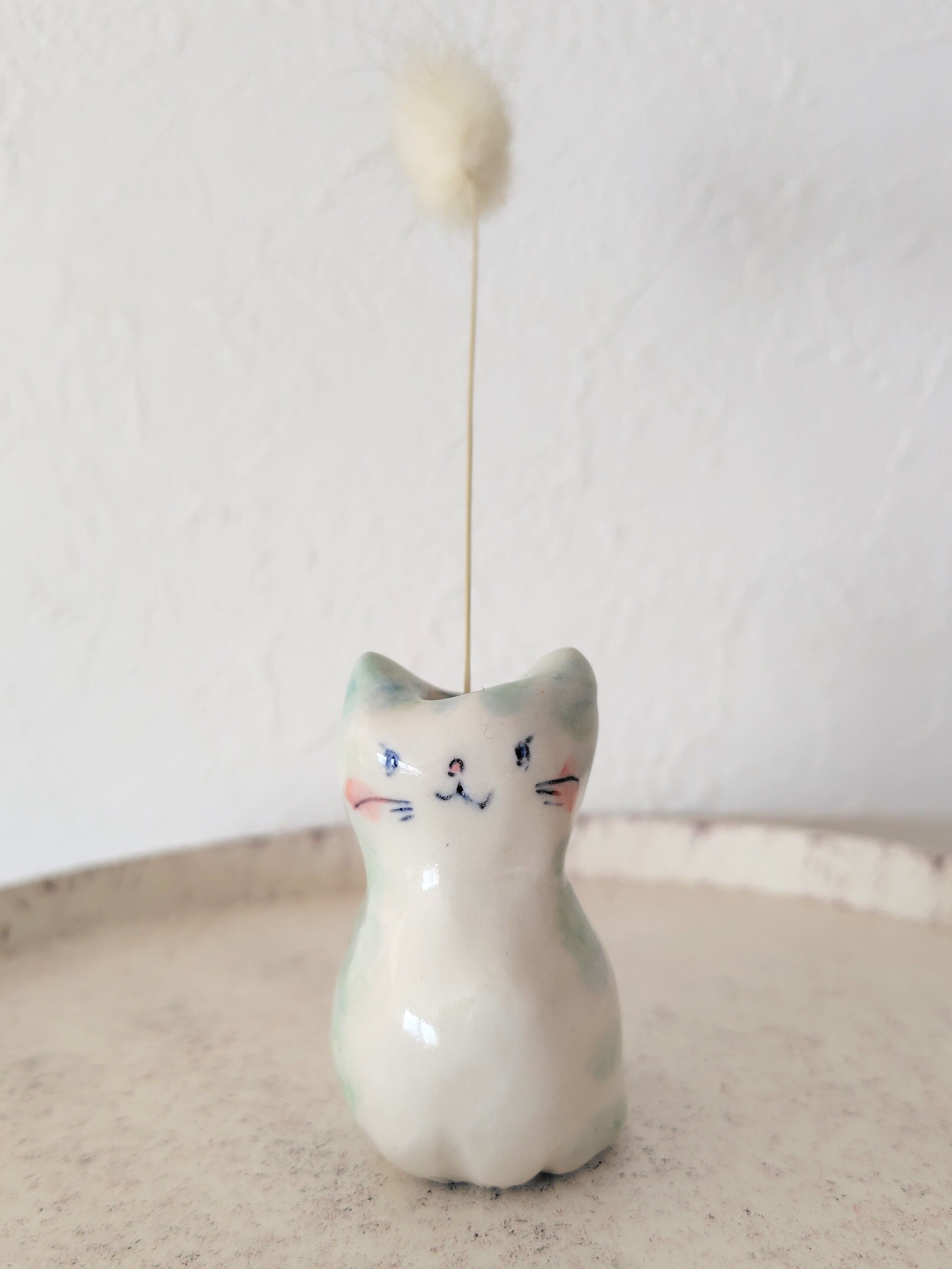 手仕事で丁寧に作られた陶磁器製のこの猫花瓶は、淡い水色が特徴です!高さ約5センチの程よいサイズで、ドライフラワーを飾ったり、生花とお水を入れる事も可能です。可愛らしい猫モチーフが施されており、見るたびに心が和むことでしょう。水色の柔らかな色合いが、お部屋に癒しをもたらしてくれること間違いなしです。