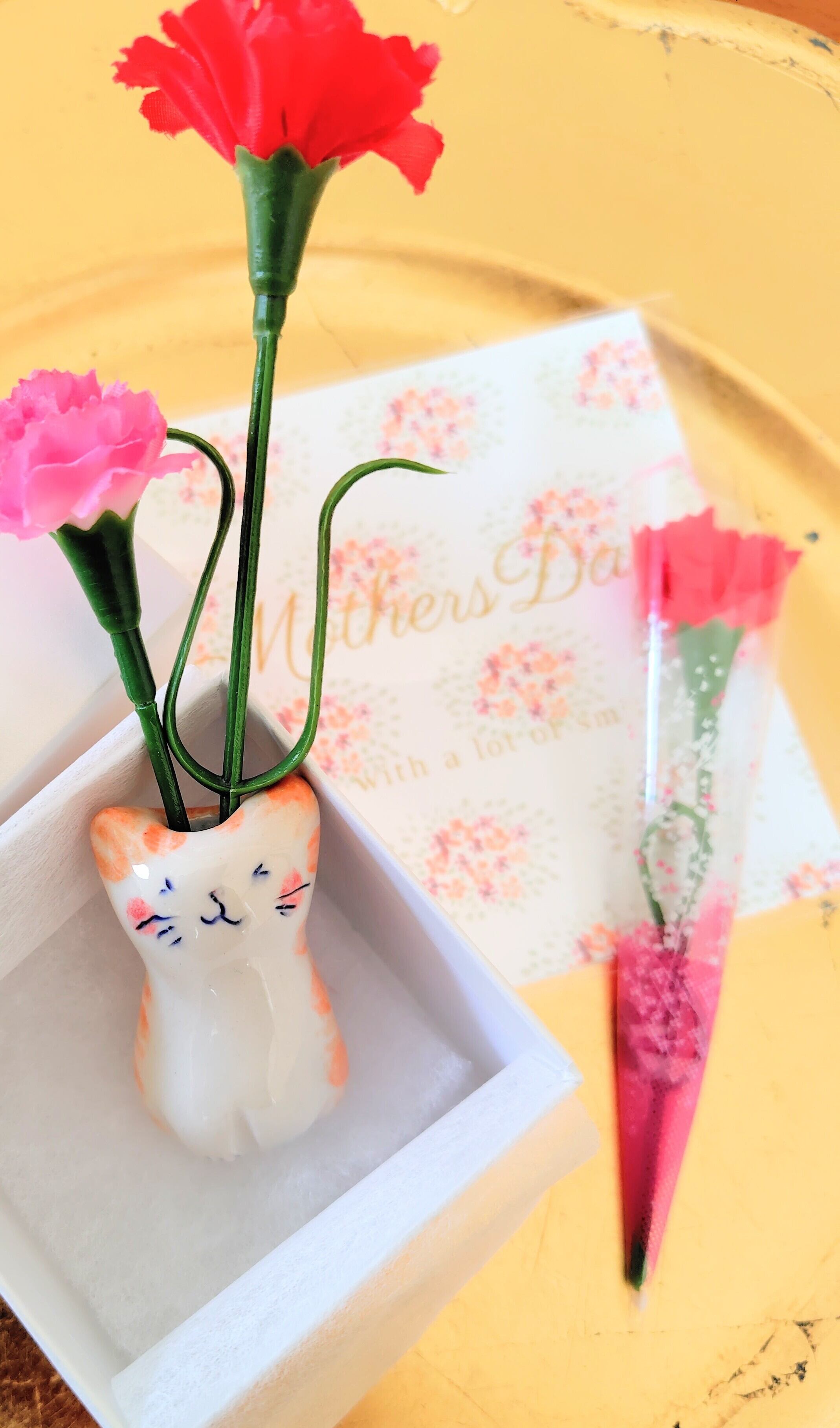 ねこ花瓶(①母の日ポストカード、②ギフトBOX、③カーネーション付き)