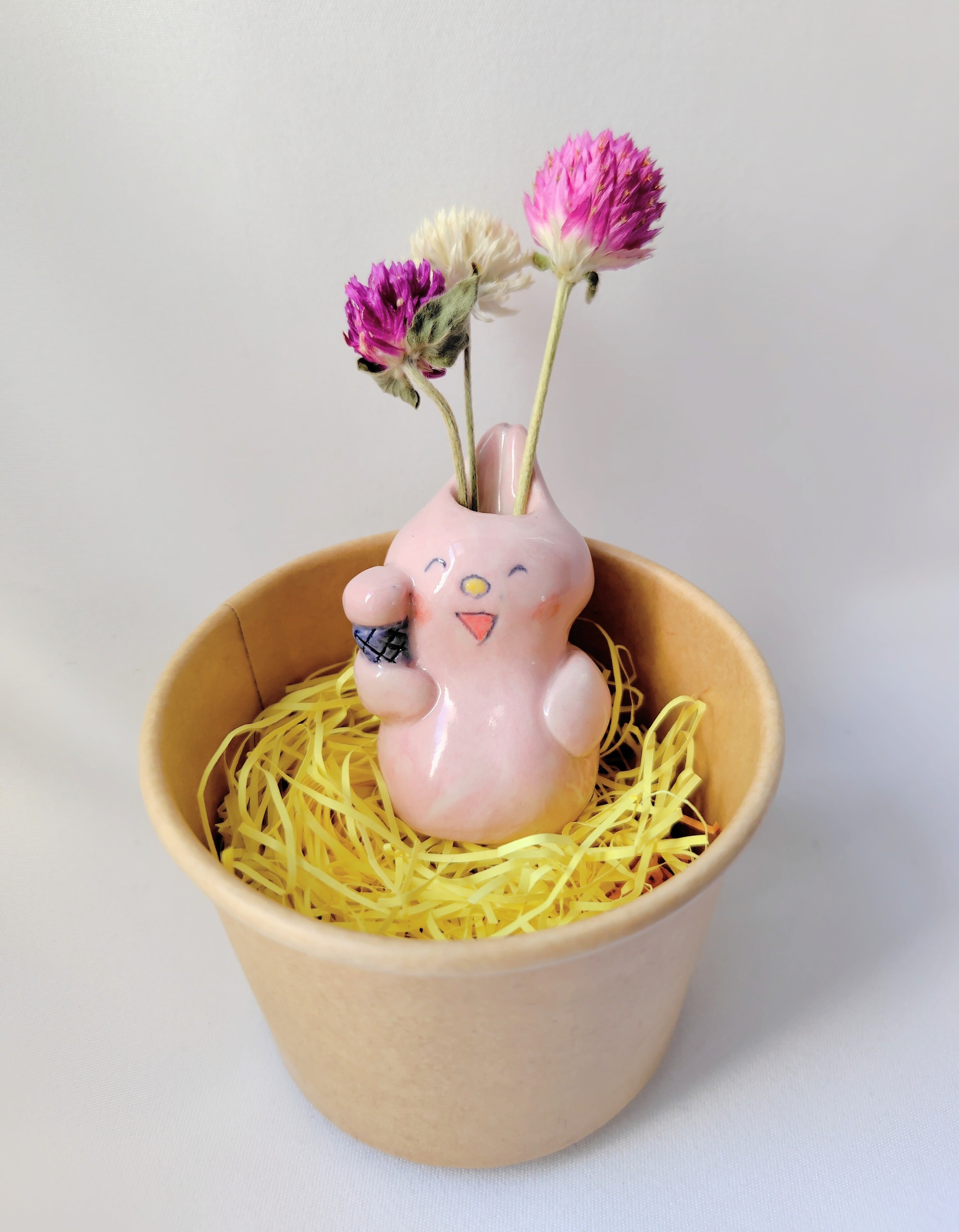 可愛らしいデザインは、日常のインテリアにも楽しい雰囲気をプラスし、温かな空間を演出します。小さな花瓶なので場所を取らず気軽に楽しめて、どんな場所でも印象的に存在する素敵な一品です。