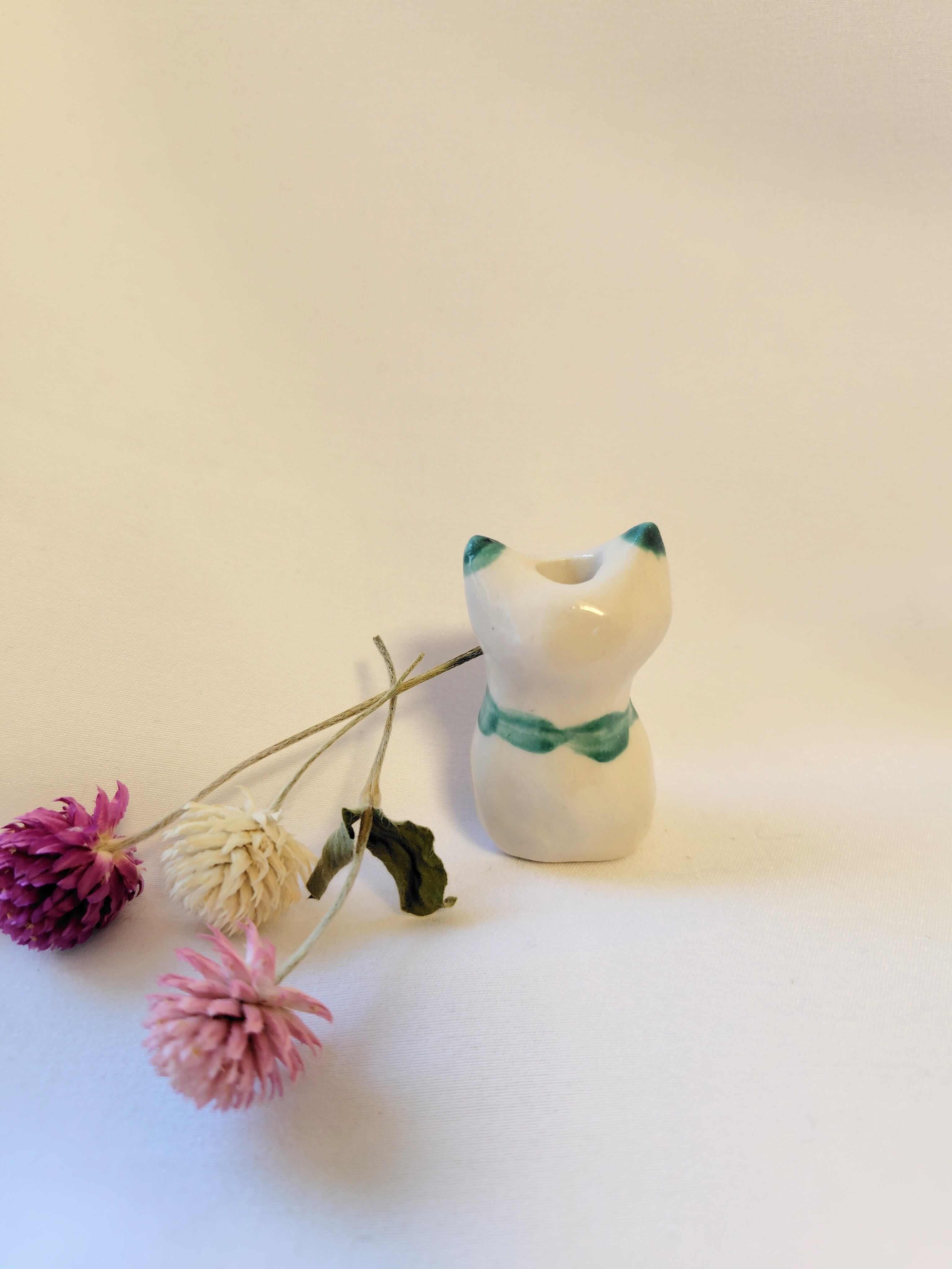 猫花瓶(グリーン スカーフ)ドライフラワー付き