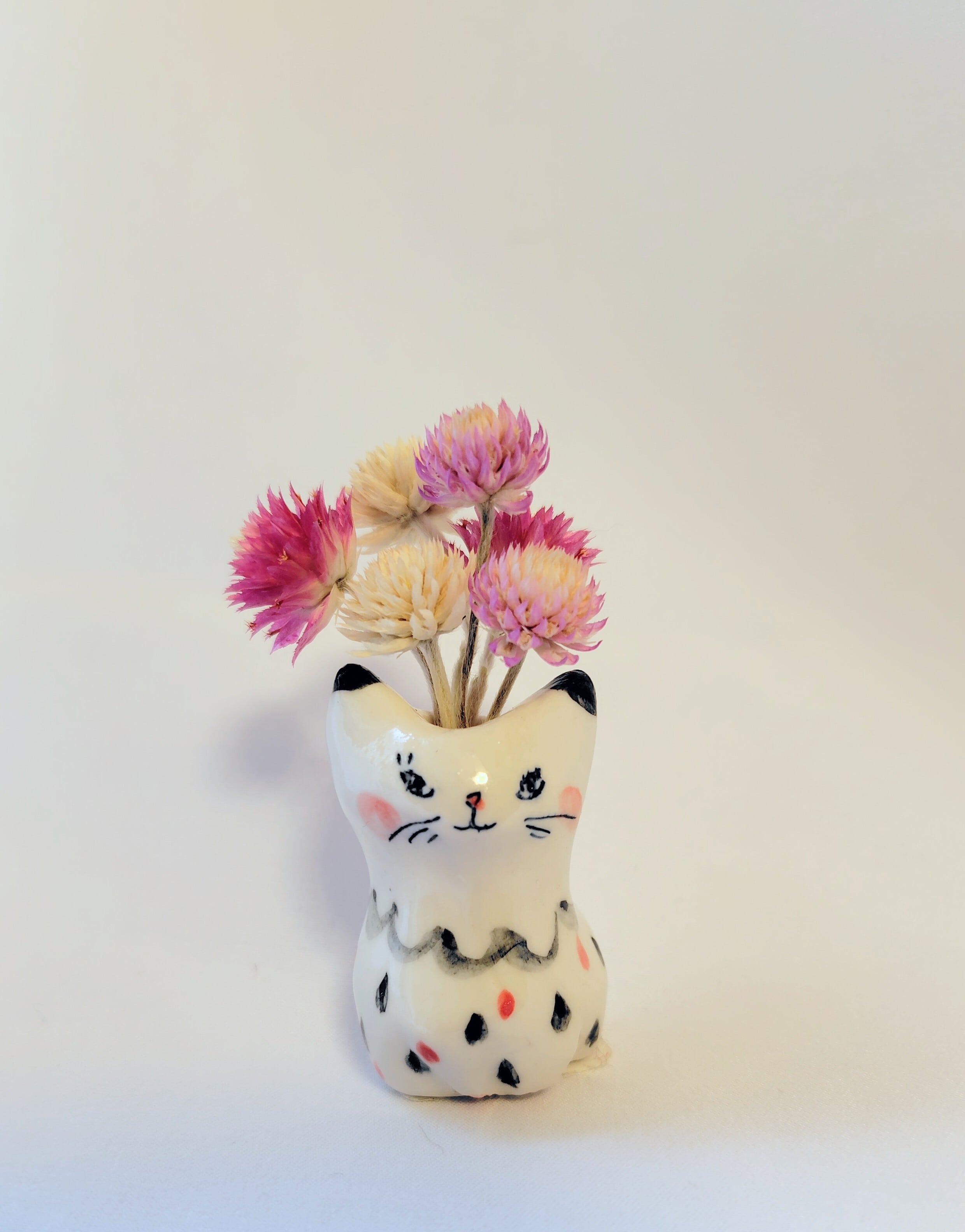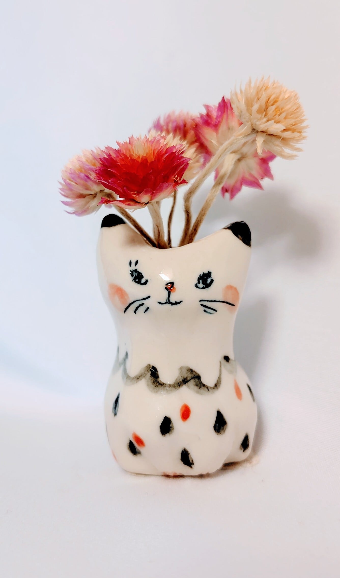 猫花瓶(赤黒ドットワンピース)ドライフラワー付き