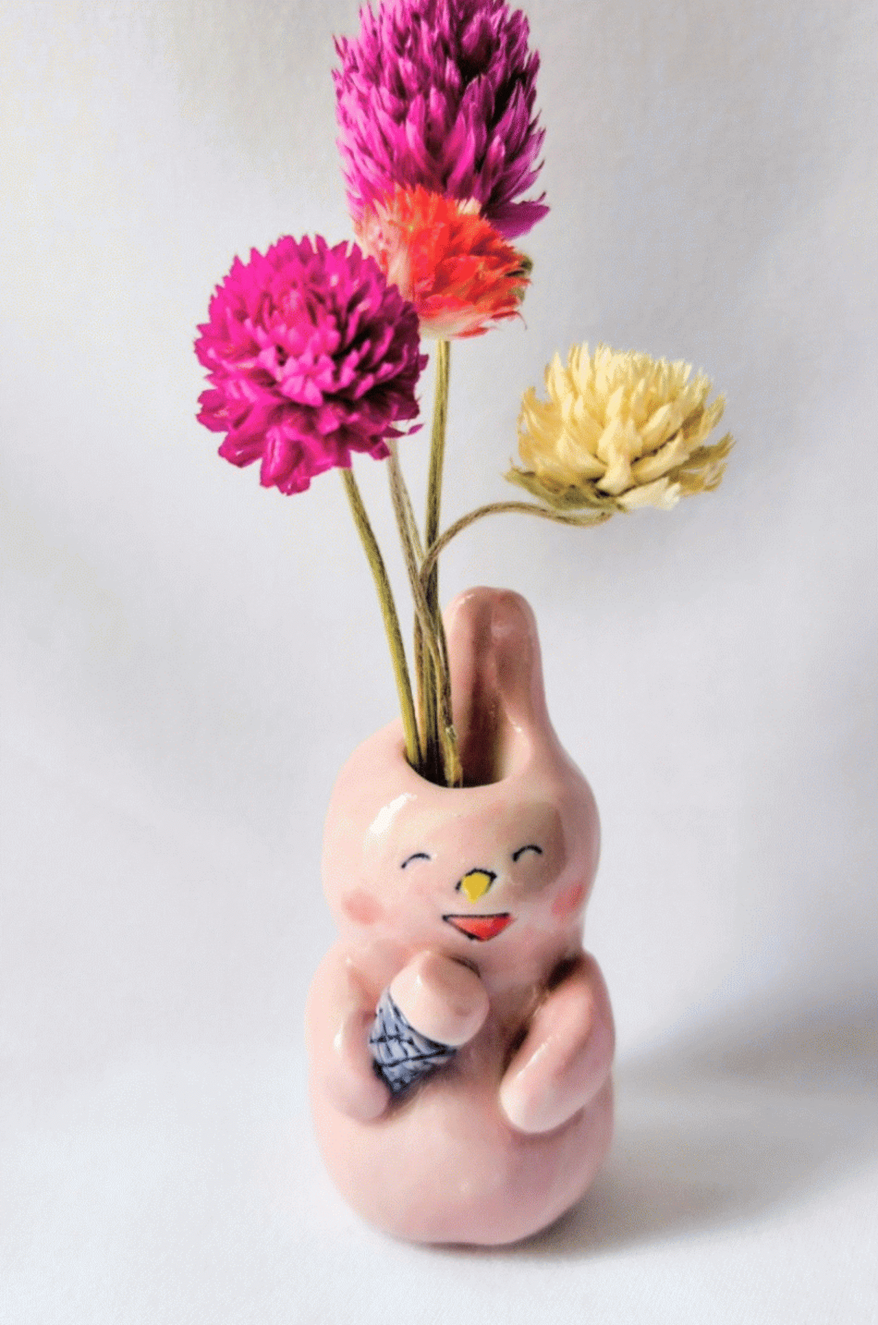 可愛らしいデザインは、日常のインテリアにも楽しい雰囲気をプラスし、温かな空間を演出します。小さな花瓶なので場所を取らず気軽に楽しめて、どんな場所でも印象的に存在する素敵な一品です。