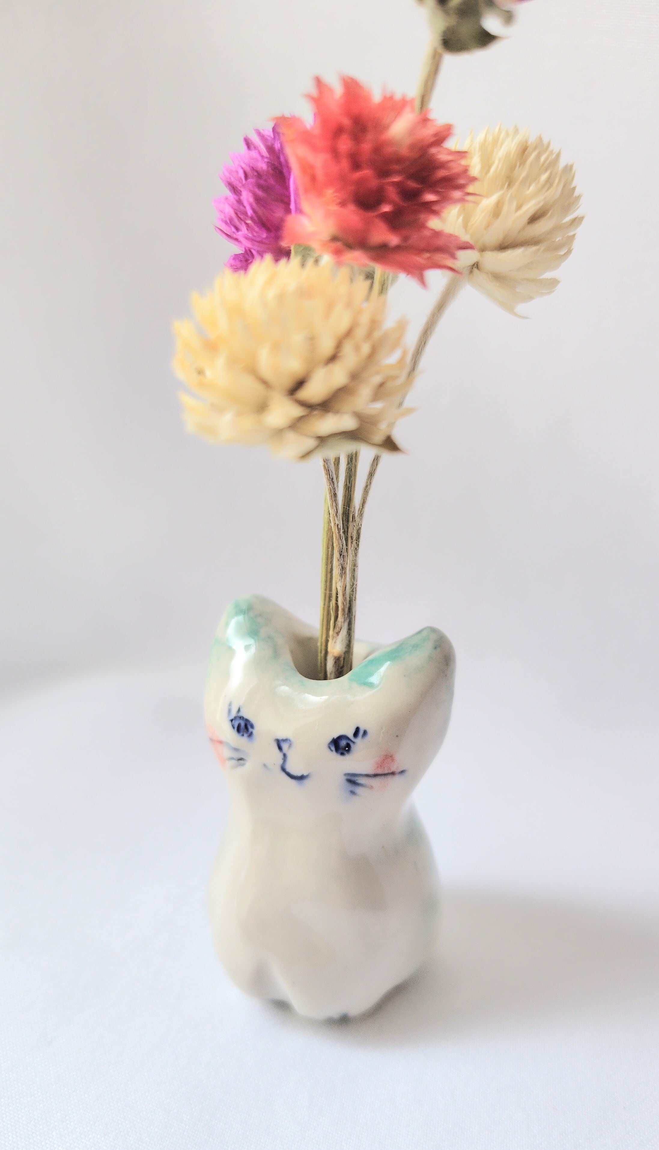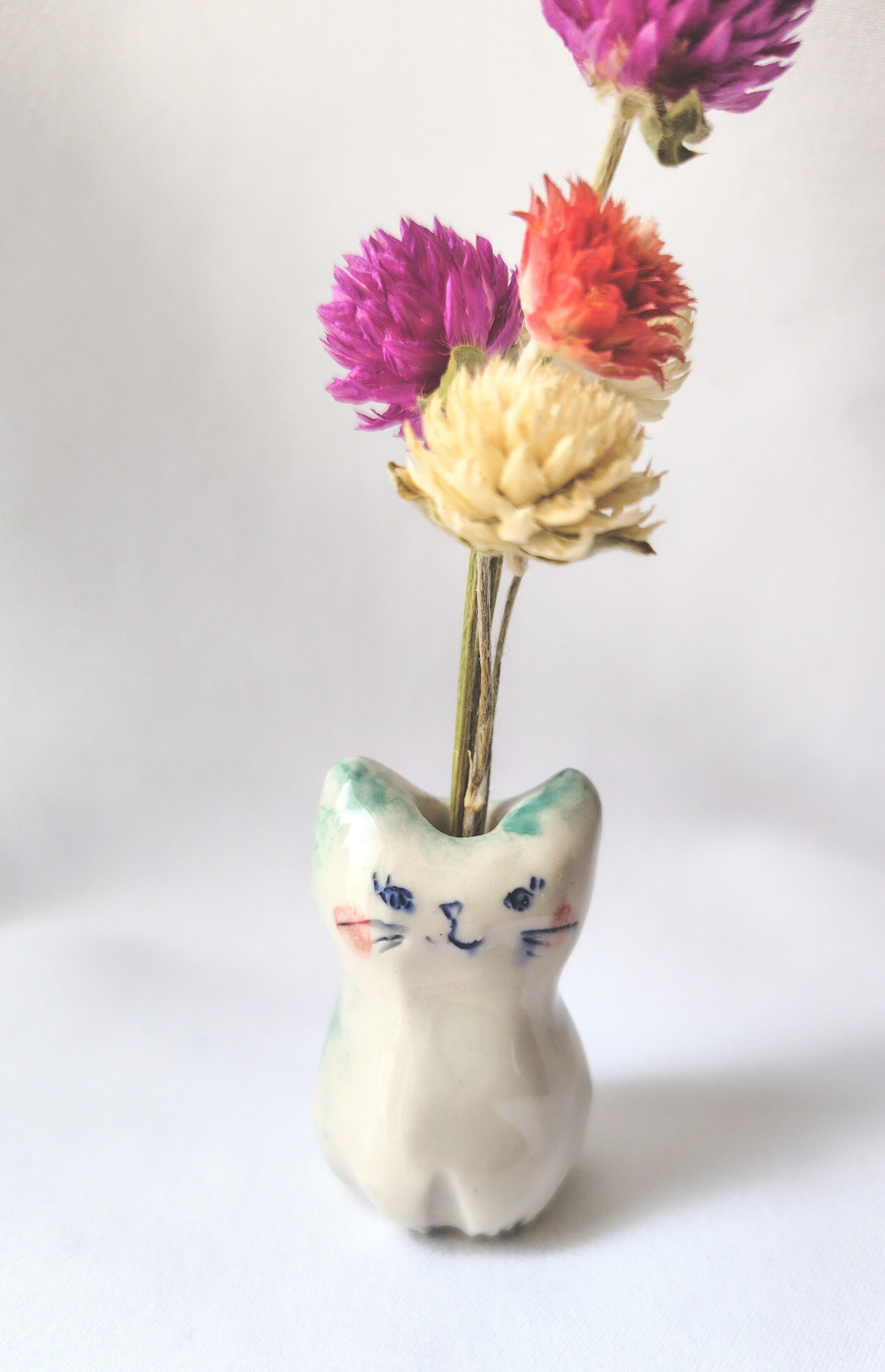 心温まるこの猫花瓶は、大切な人への贈り物にも最適です!お花を愛する方や猫好きな方にも、ぴったりです。独特の手仕事による1点物として、相手の心に残る特別なギフトとして、ぜひご提案ください!!
