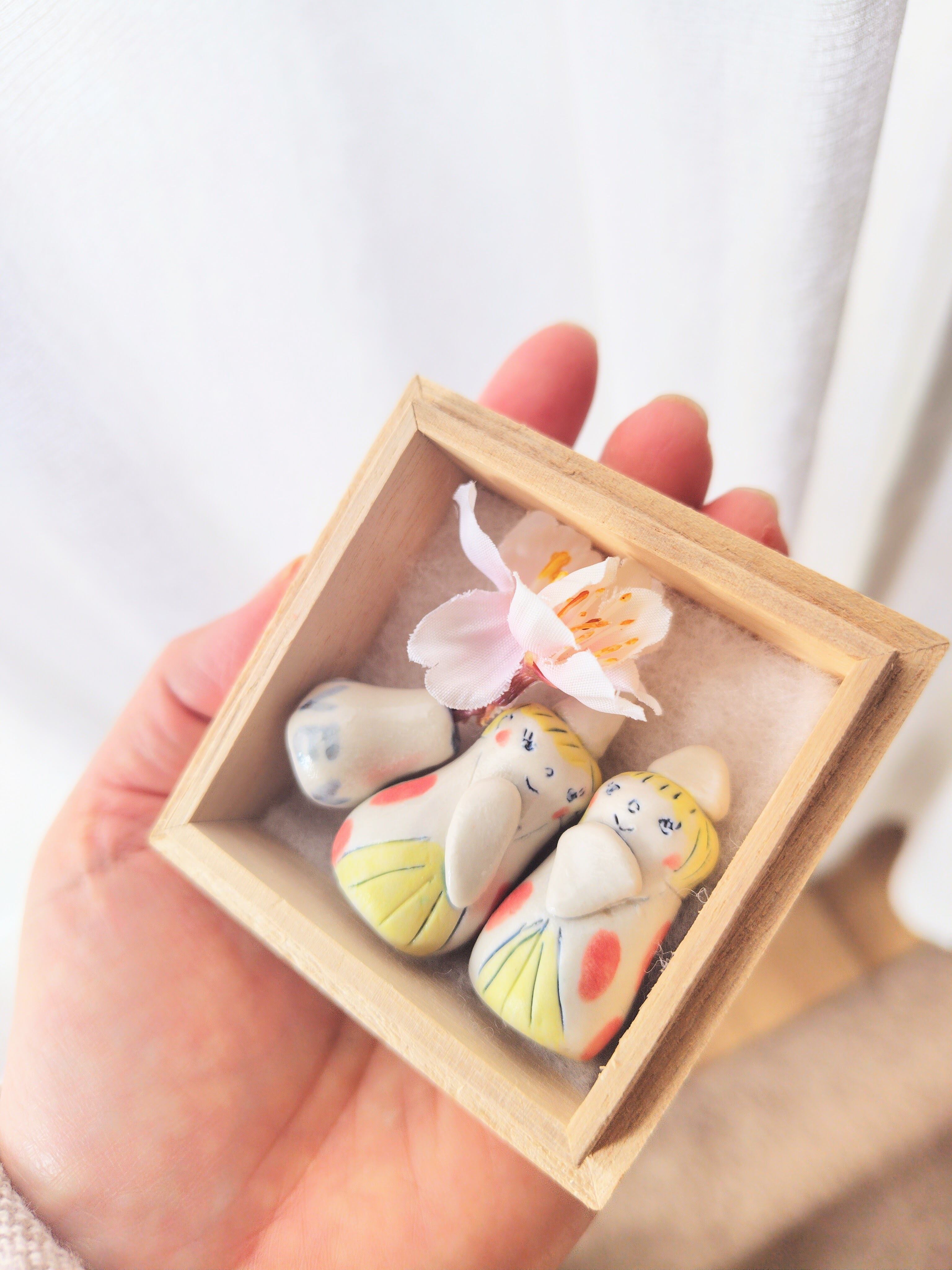 繊細な陶磁器から生み出されたお雛様は、佐々木ヨーコが一つ一つ丁寧に手掛けた作品です。形や色合いはそれぞれ異なり、個性豊かな一点ものとなっています。なかなか出会えない、特別な存在感を持つお雛様です。