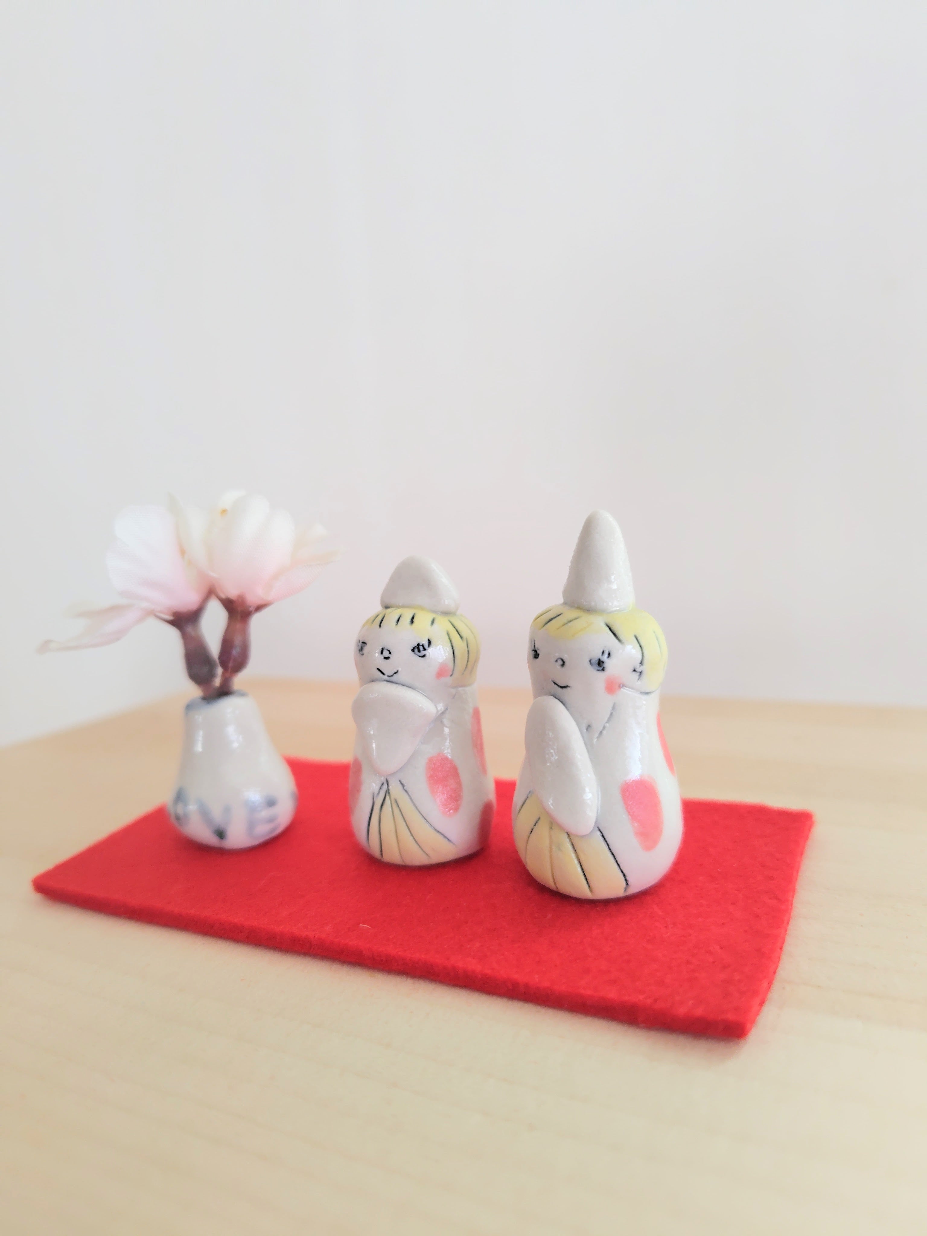 赤いドットのペアのお着物と、花瓶のLOVEが愛らしいお雛様です