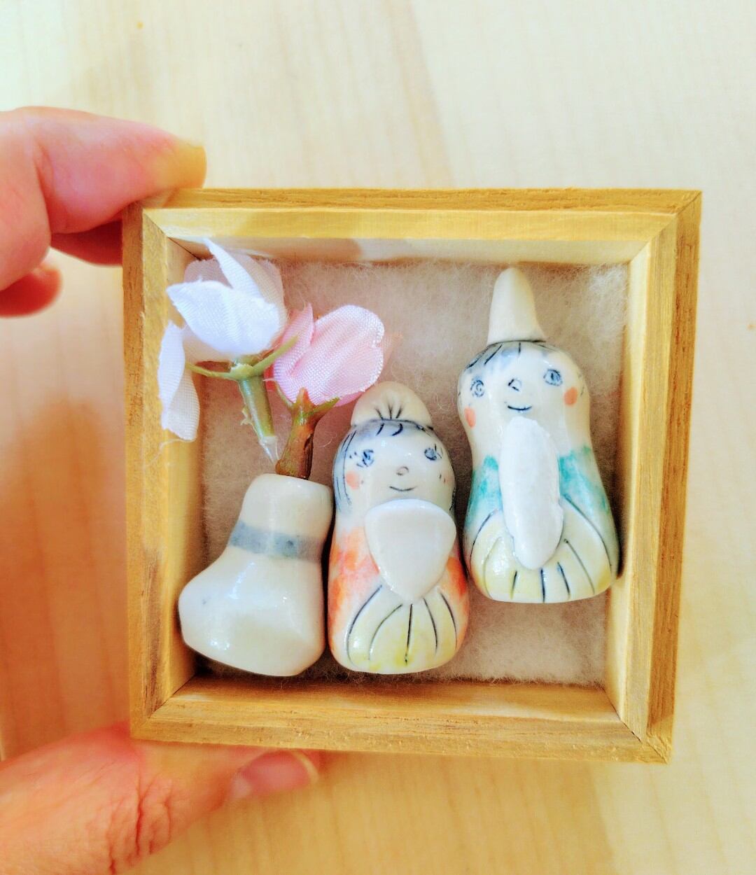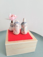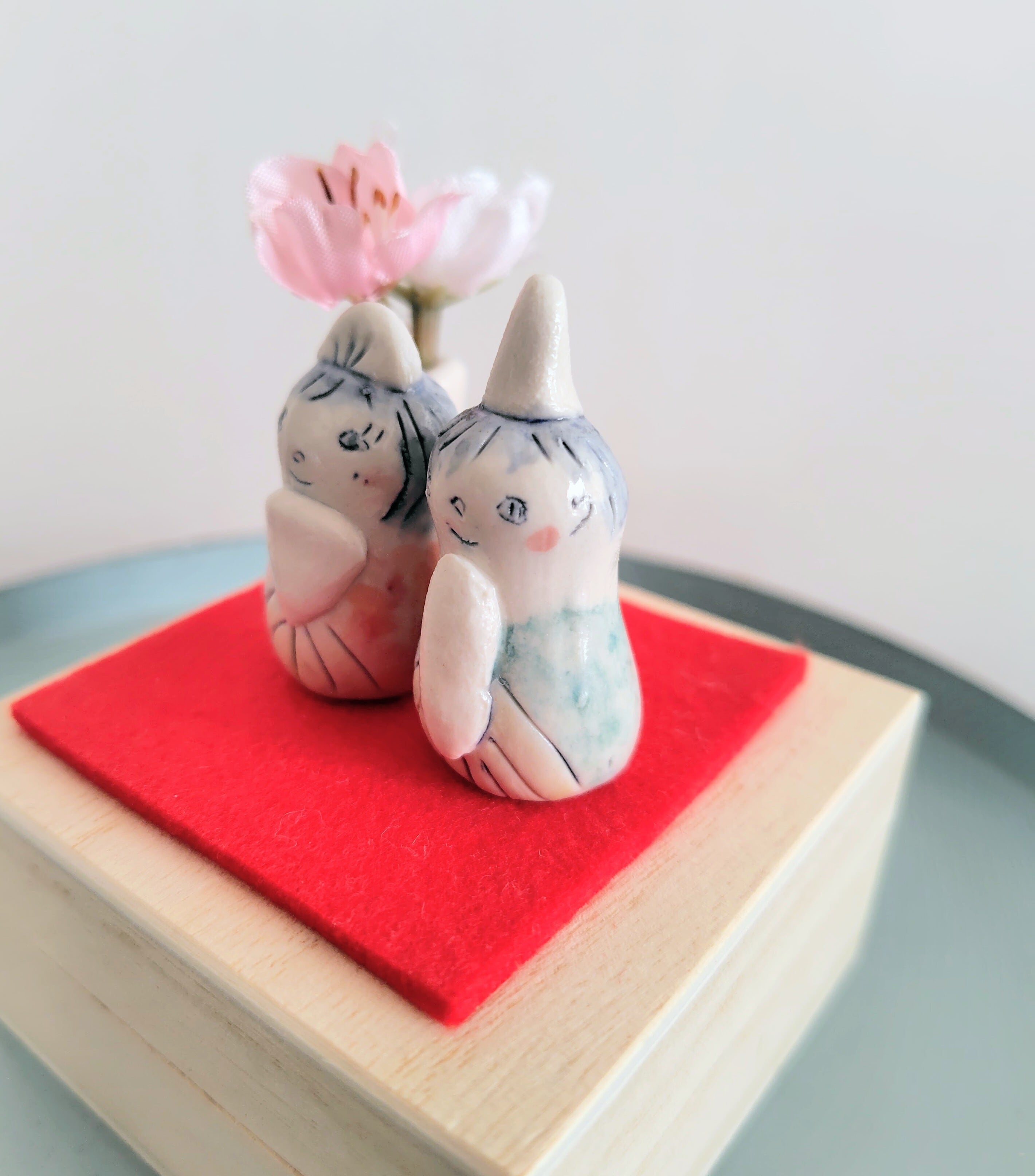 繊細な陶磁器から生み出されたお雛様は、佐々木ヨーコが一つ一つ丁寧に手掛けた作品です。形や色合いはそれぞれ異なり、個性豊かな一点ものとなっています。なかなか出会えない、特別な存在感を持つお雛様です。