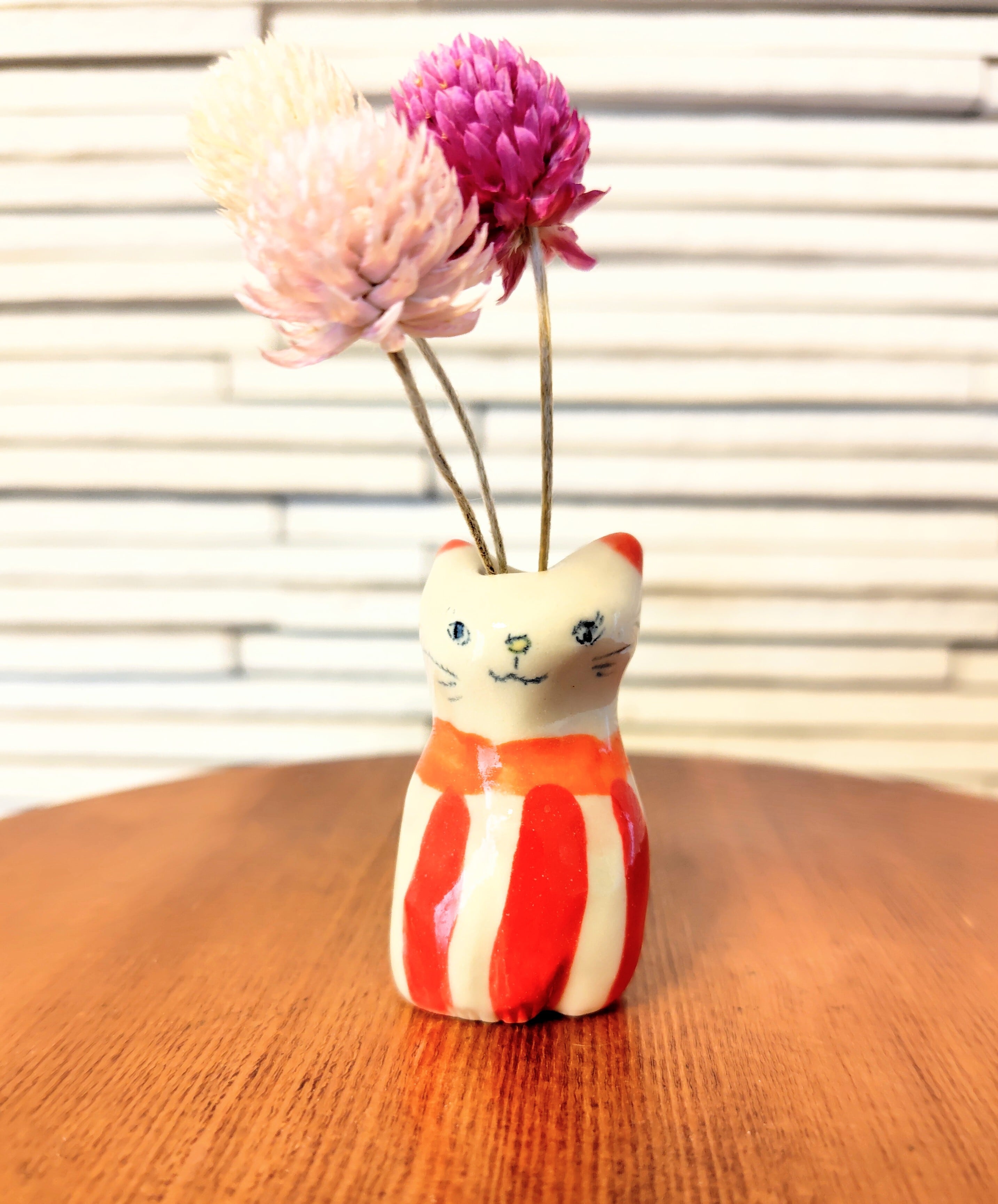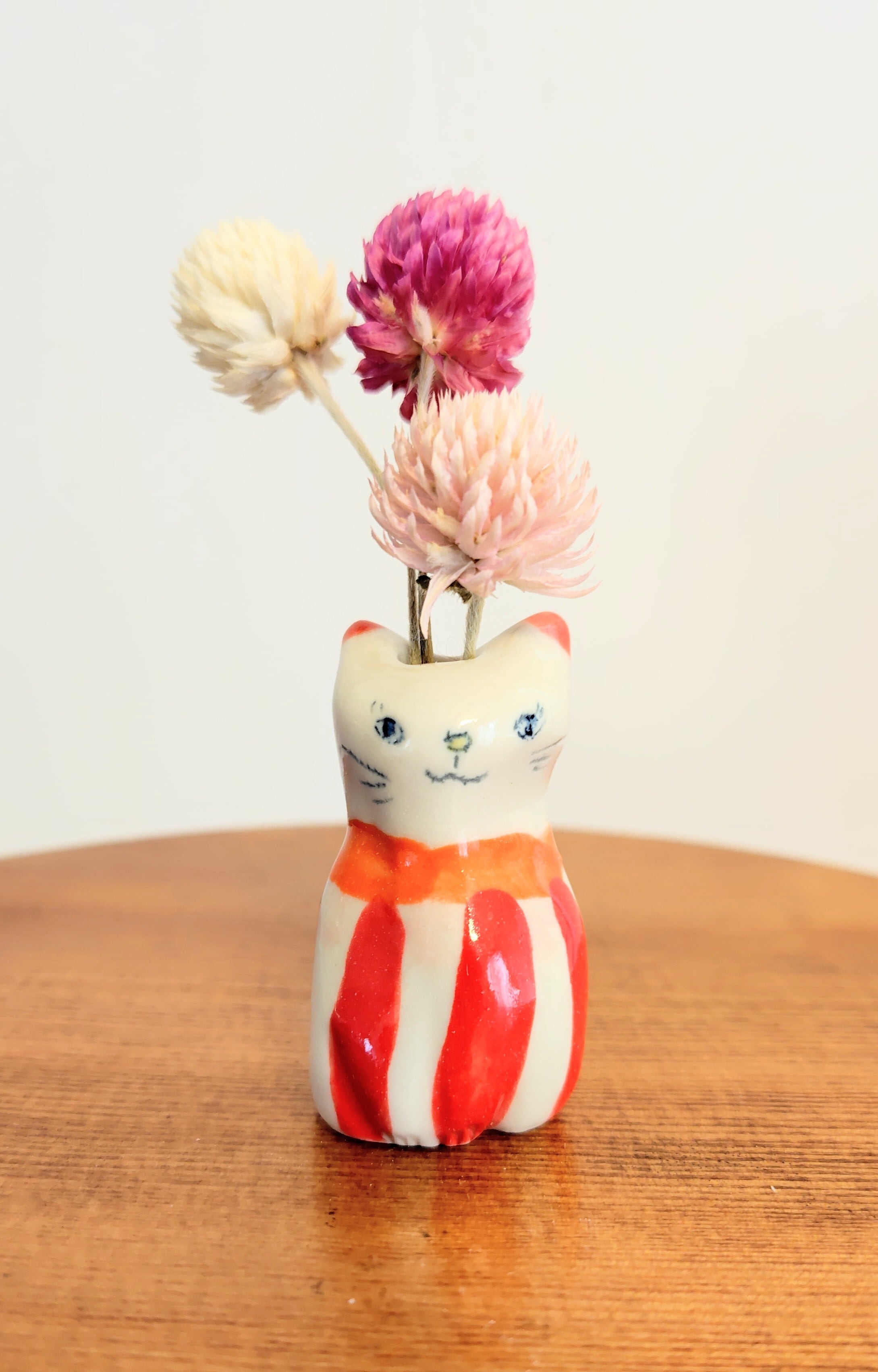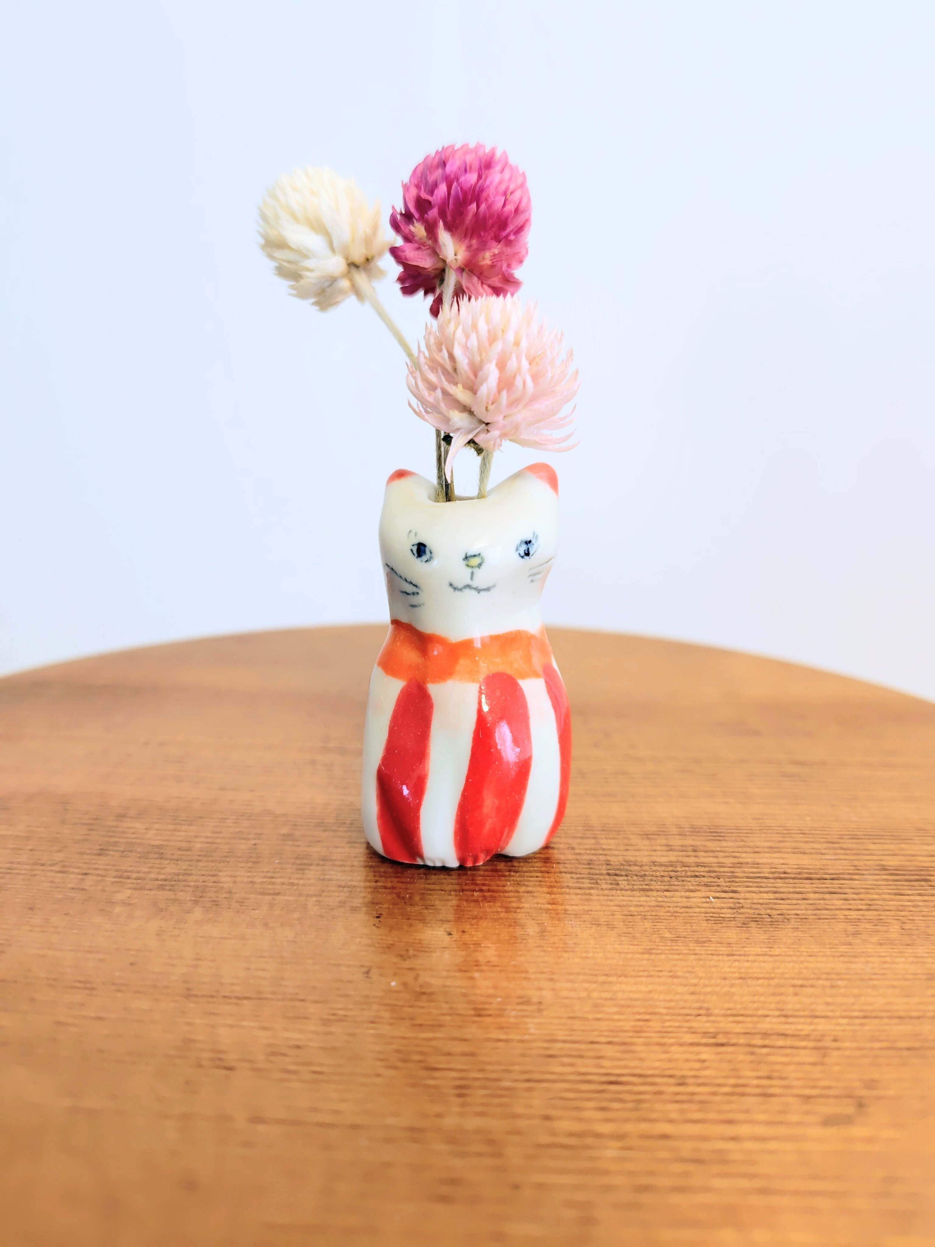 高さ約5センチセンチという絶妙なサイズ感で、ドライフラワーや、生花をお水を入れて飾る事もできます。お香立てとして使ったり、縁起物のねこちゃんのお髭入れとして使って楽しむこともできて、使い方は自由^_^ 可愛らしい姿を見るたびに、心が和むことでしょう!