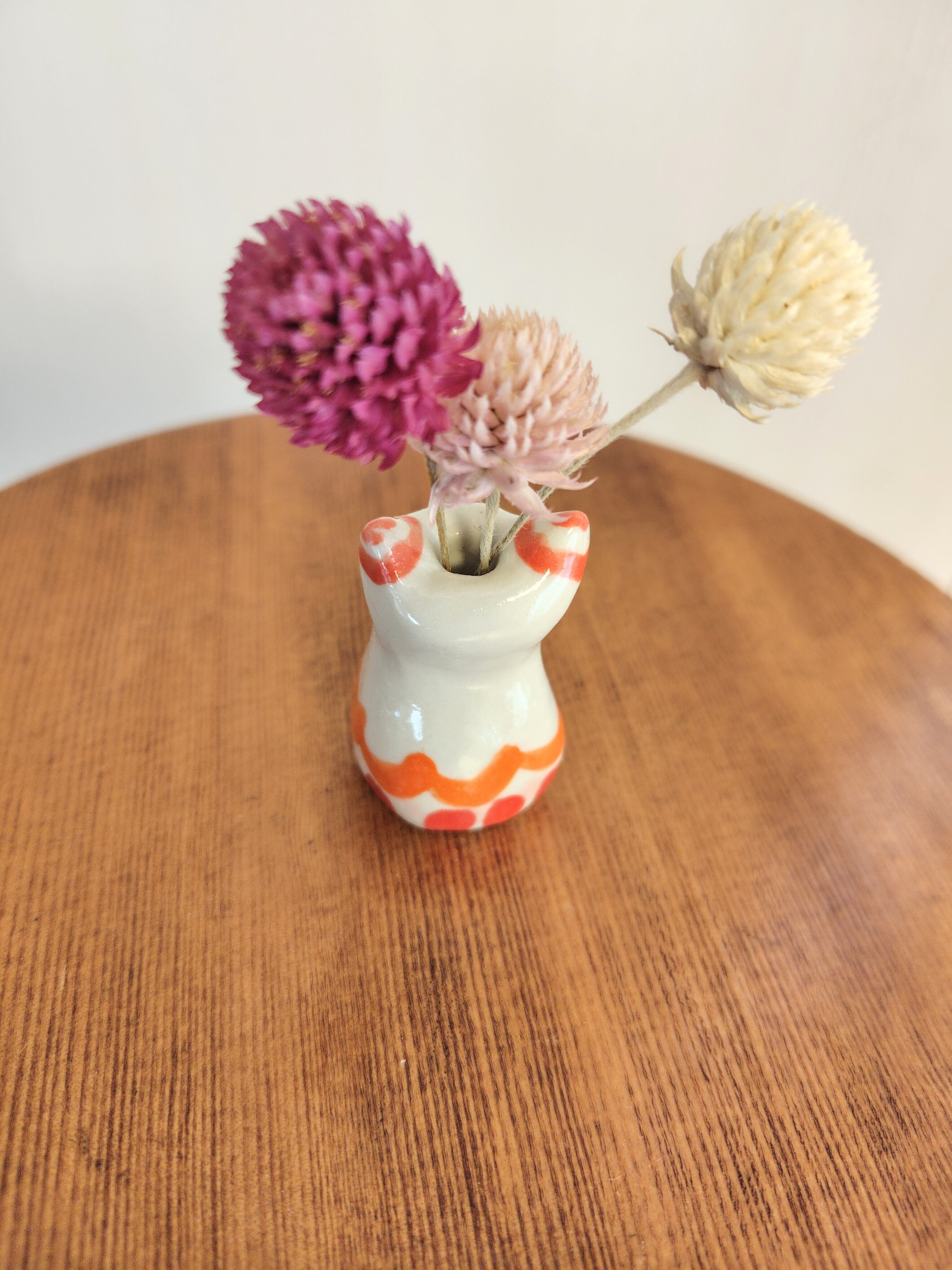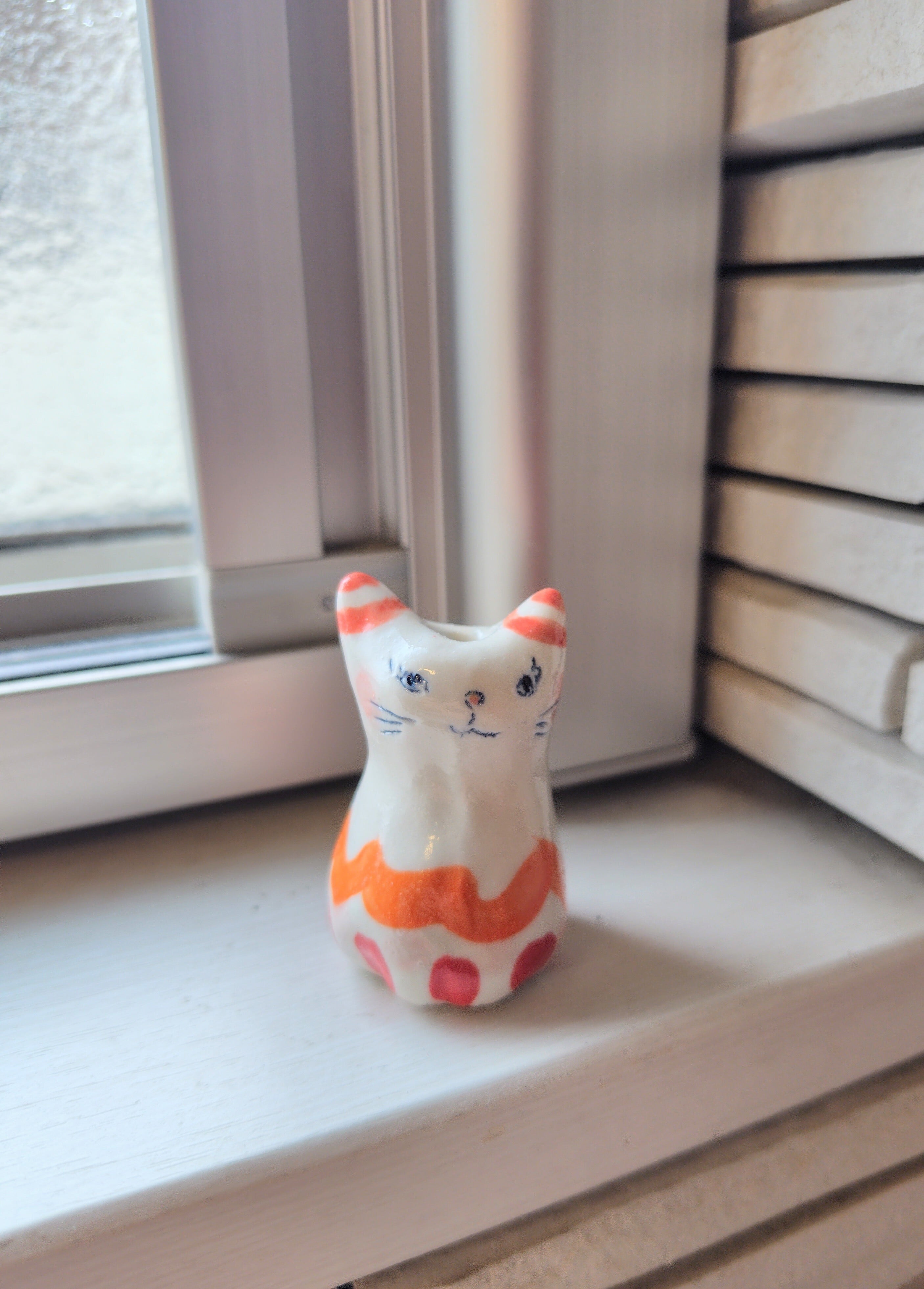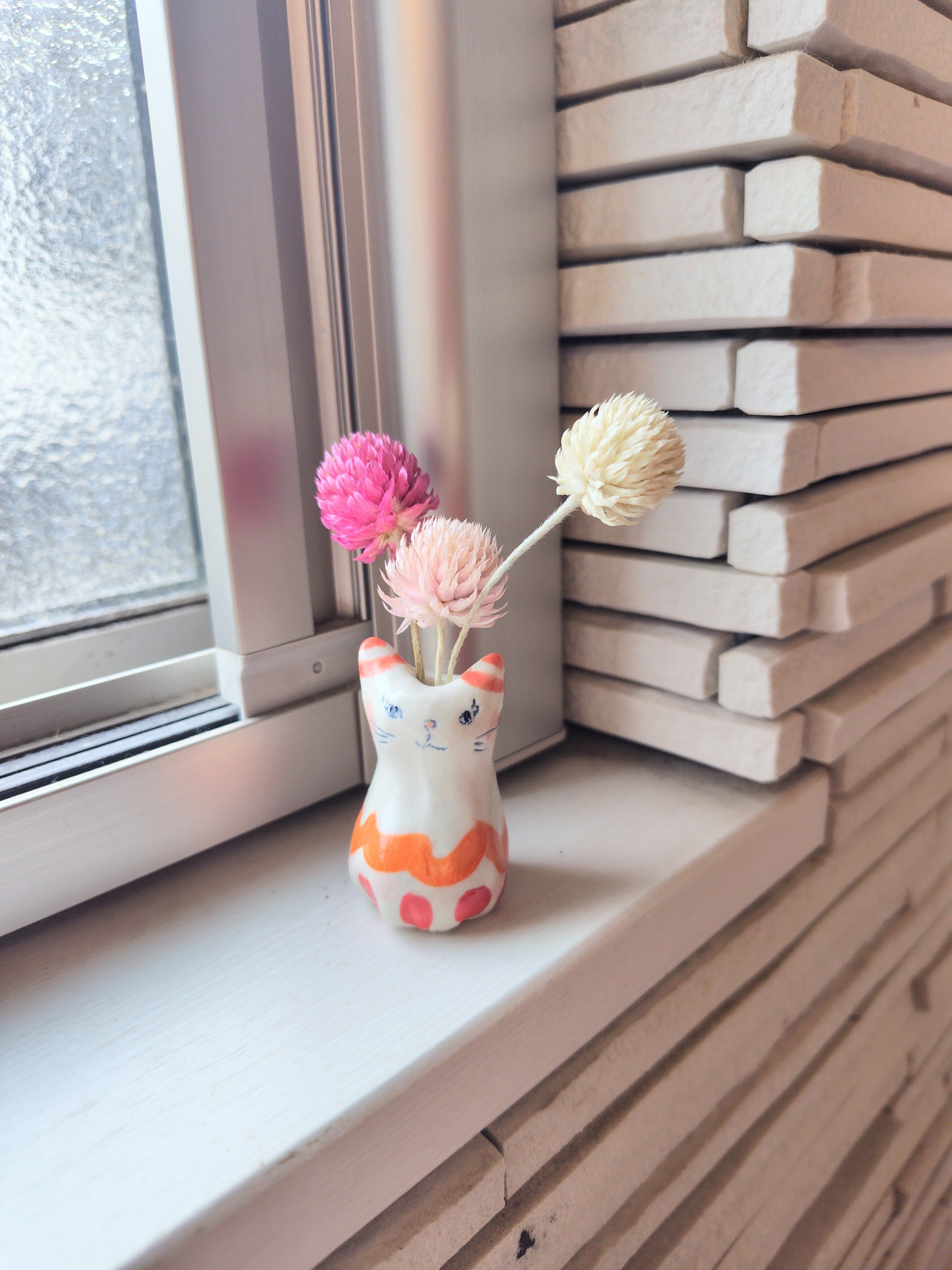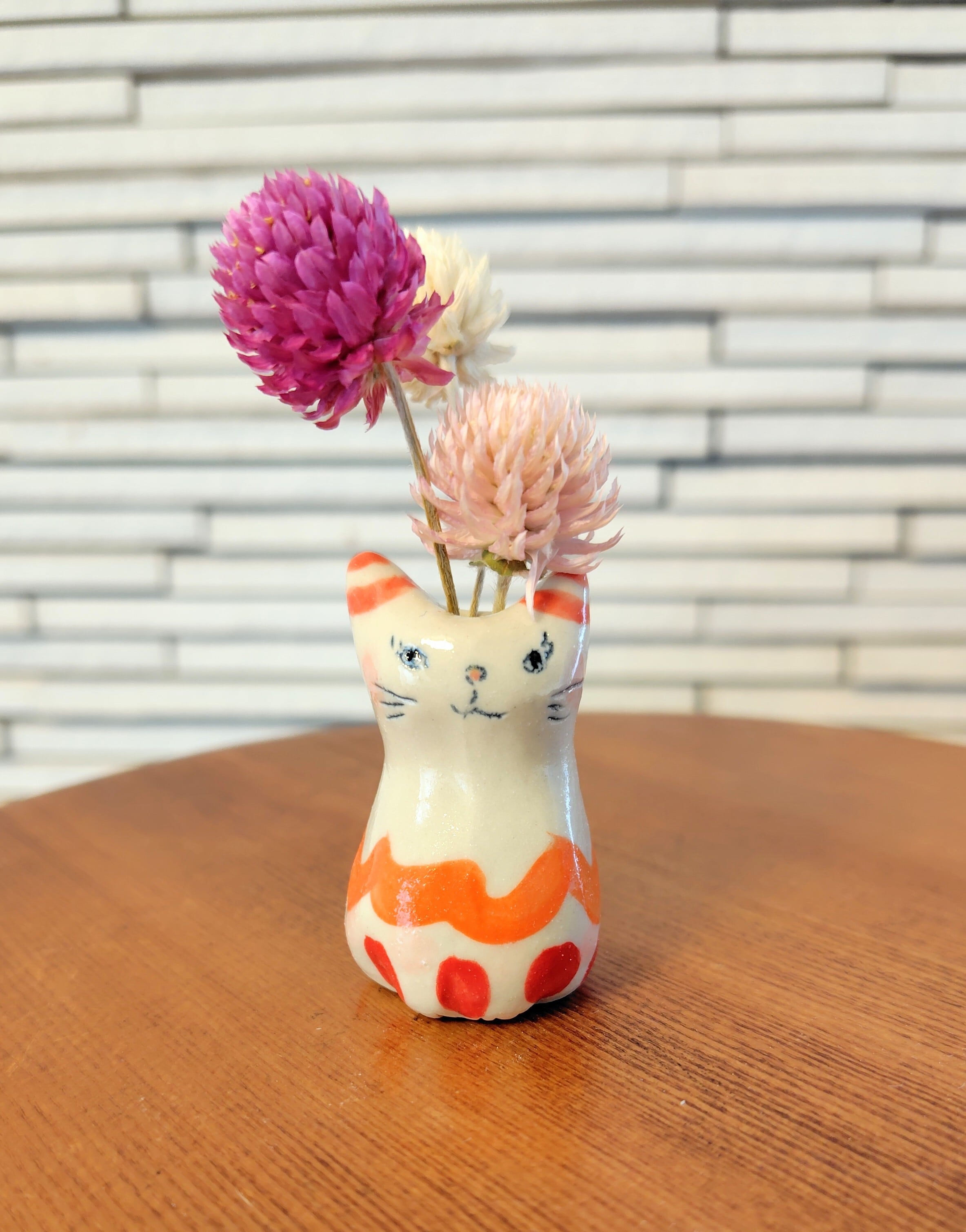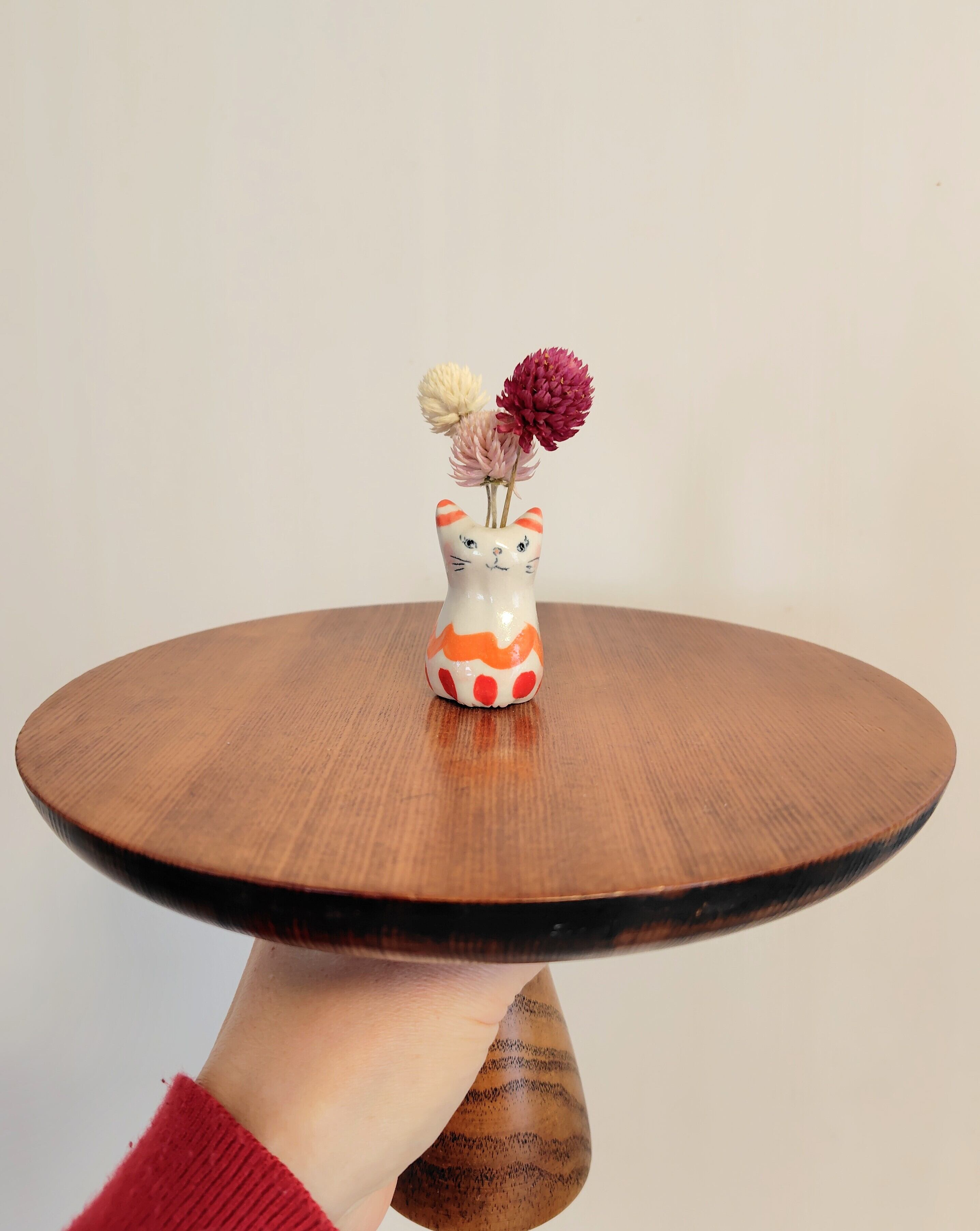 高さ約5センチセンチという絶妙なサイズ感で、ドライフラワーや、生花をお水を入れて飾る事もできます。お香立てとして使ったり、縁起物のねこちゃんのお髭入れとして使って楽しむこともできて、使い方は自由^_^ 可愛らしい姿を見るたびに、心が和むことでしょう!