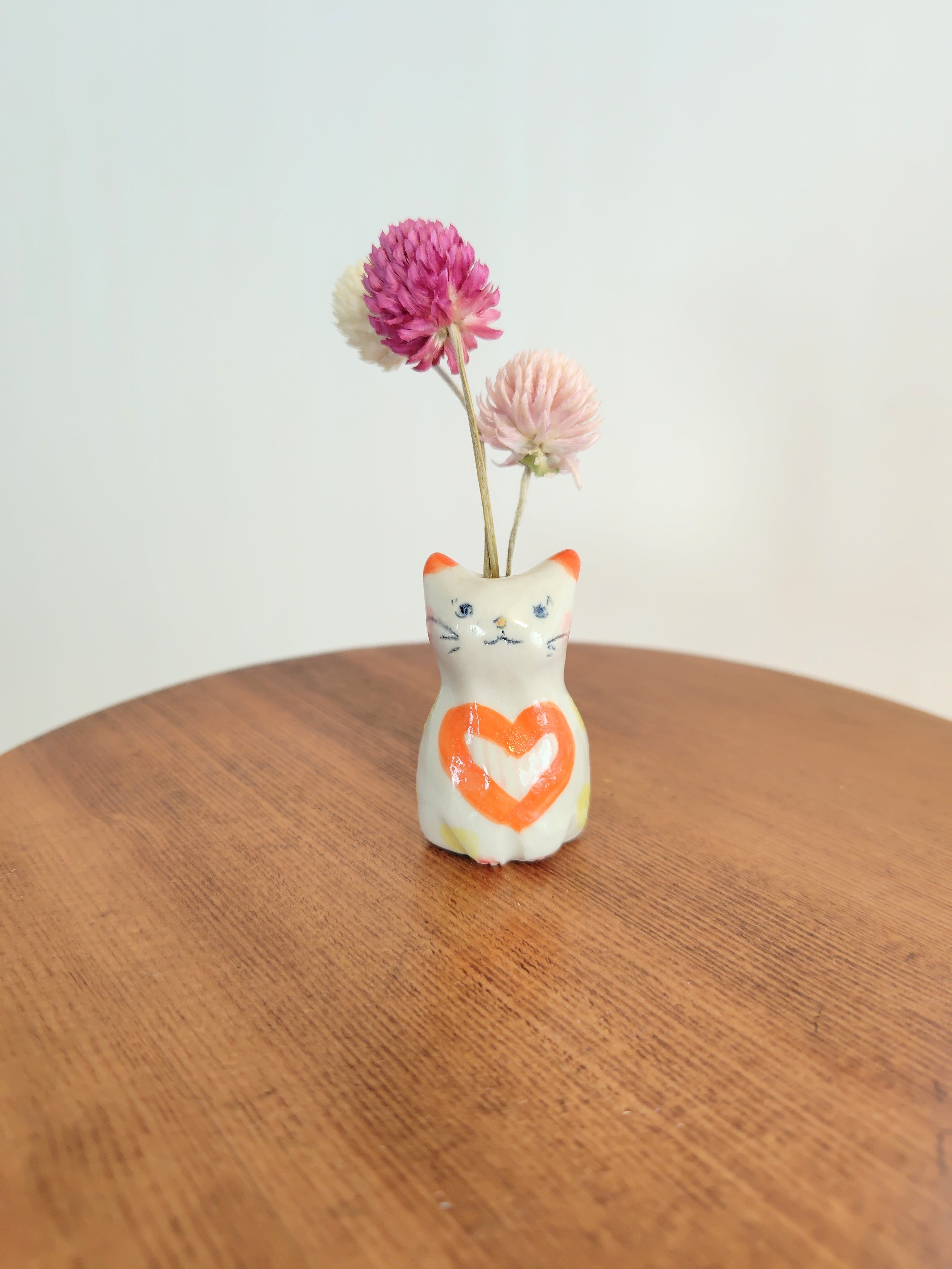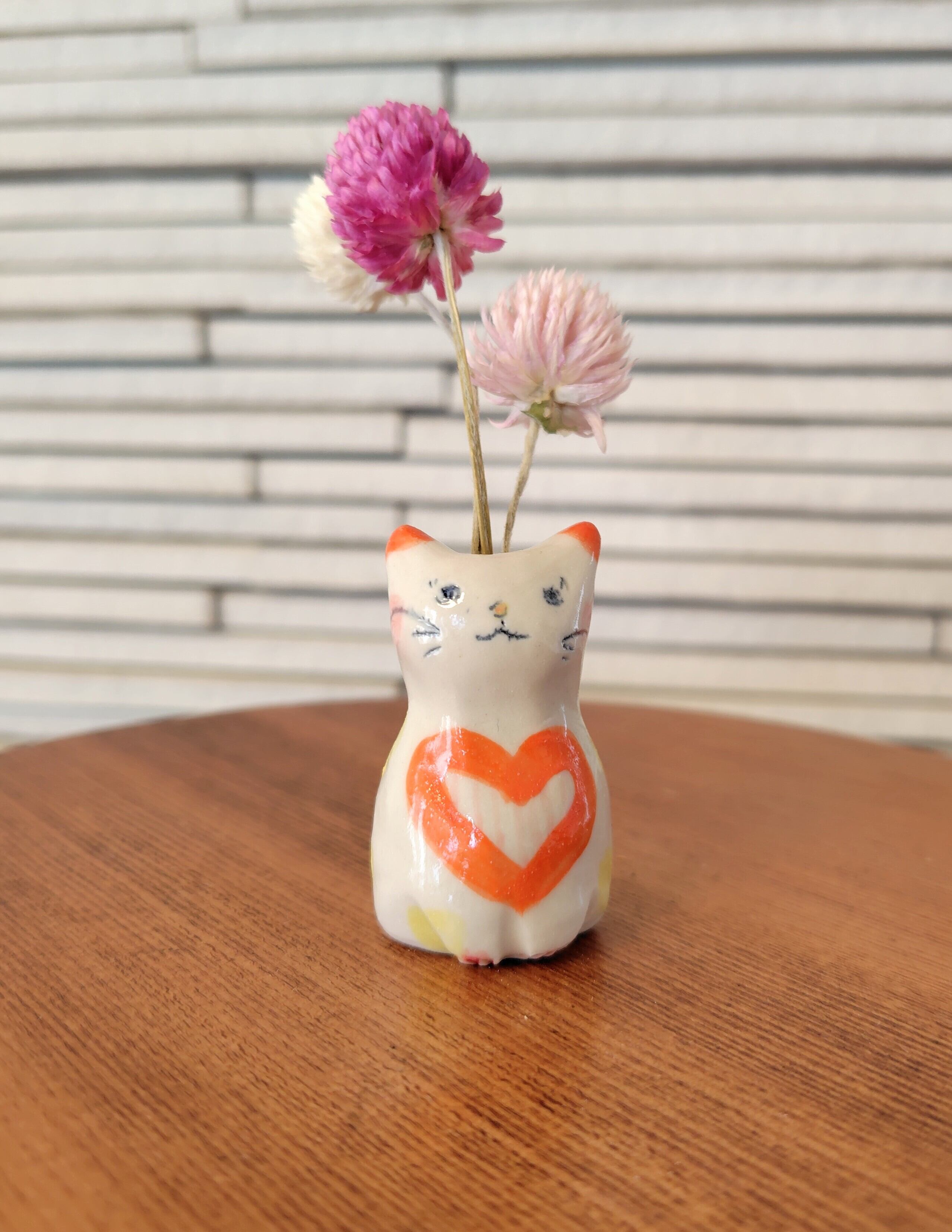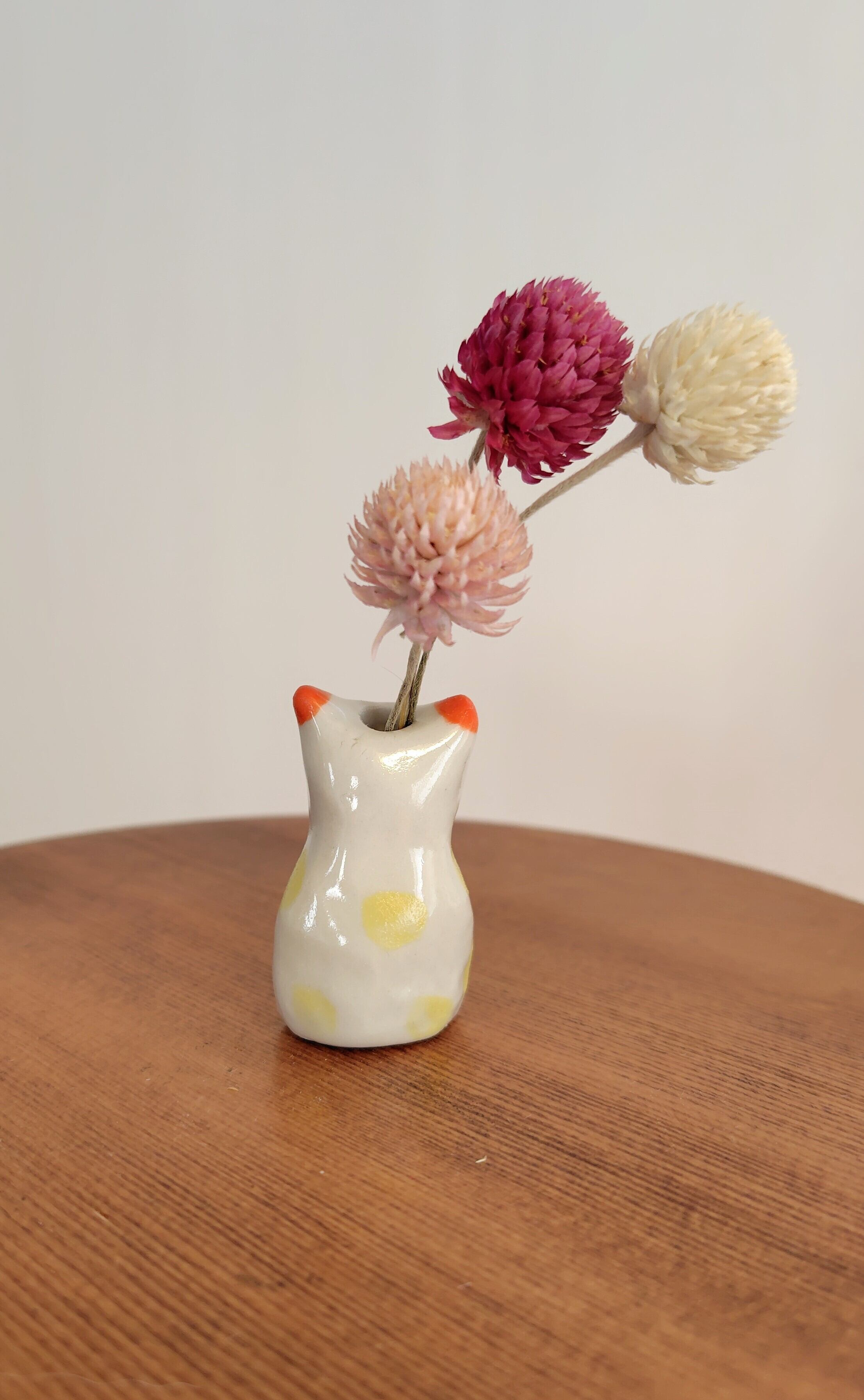 高さ約5センチセンチという絶妙なサイズ感で、ドライフラワーや、生花をお水を入れて飾る事もできます。お香立てとして使ったり、縁起物のねこちゃんのお髭入れとして使って楽しむこともできて、使い方は自由^_^ 可愛らしい姿を見るたびに、心が和むことでしょう!