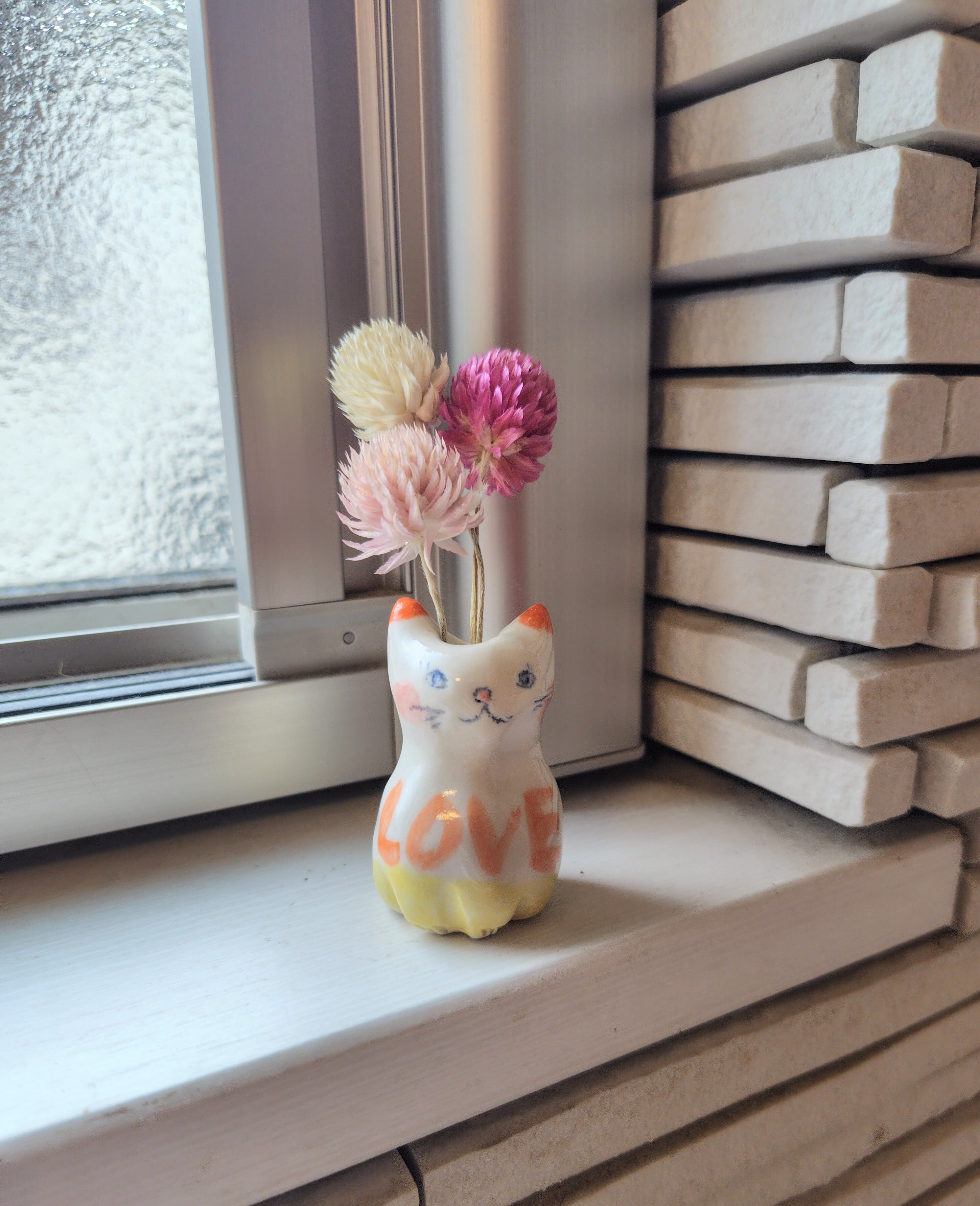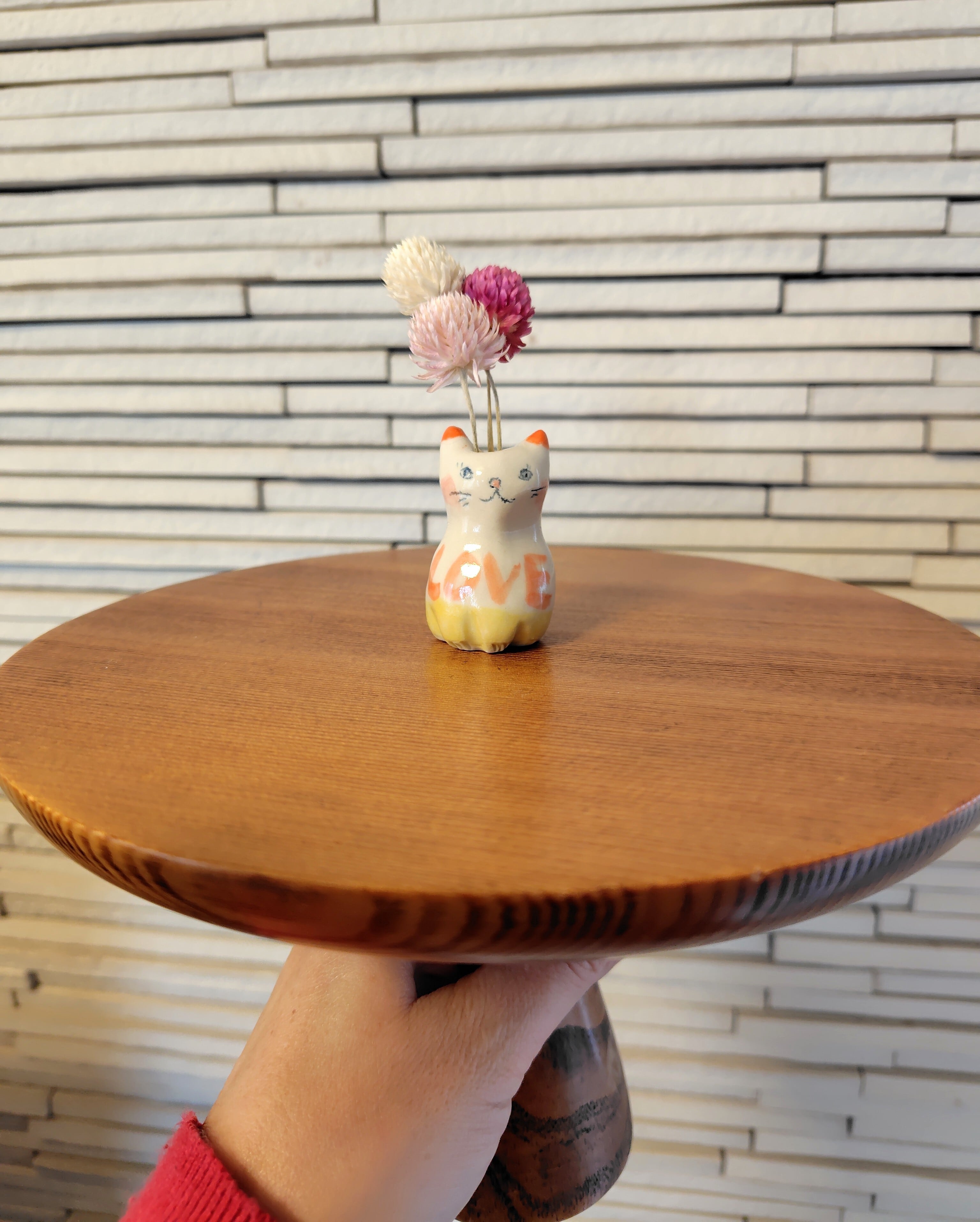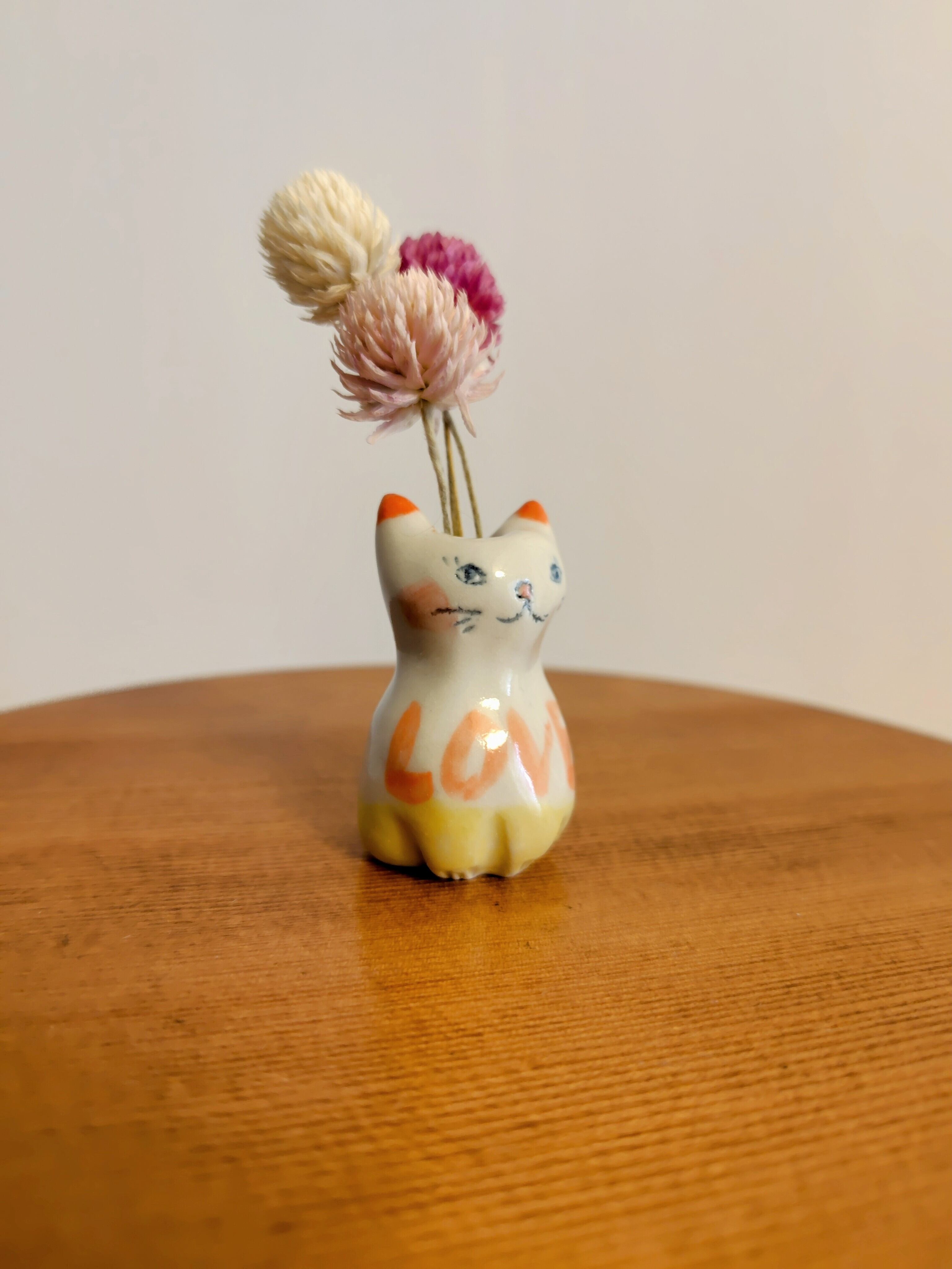 高さ約5センチセンチという絶妙なサイズ感で、ドライフラワーや、生花をお水を入れて飾る事もできます。お香立てとして使ったり、縁起物のねこちゃんのお髭入れとして使って楽しむこともできて、使い方は自由^_^ 可愛らしい姿を見るたびに、心が和むことでしょう!