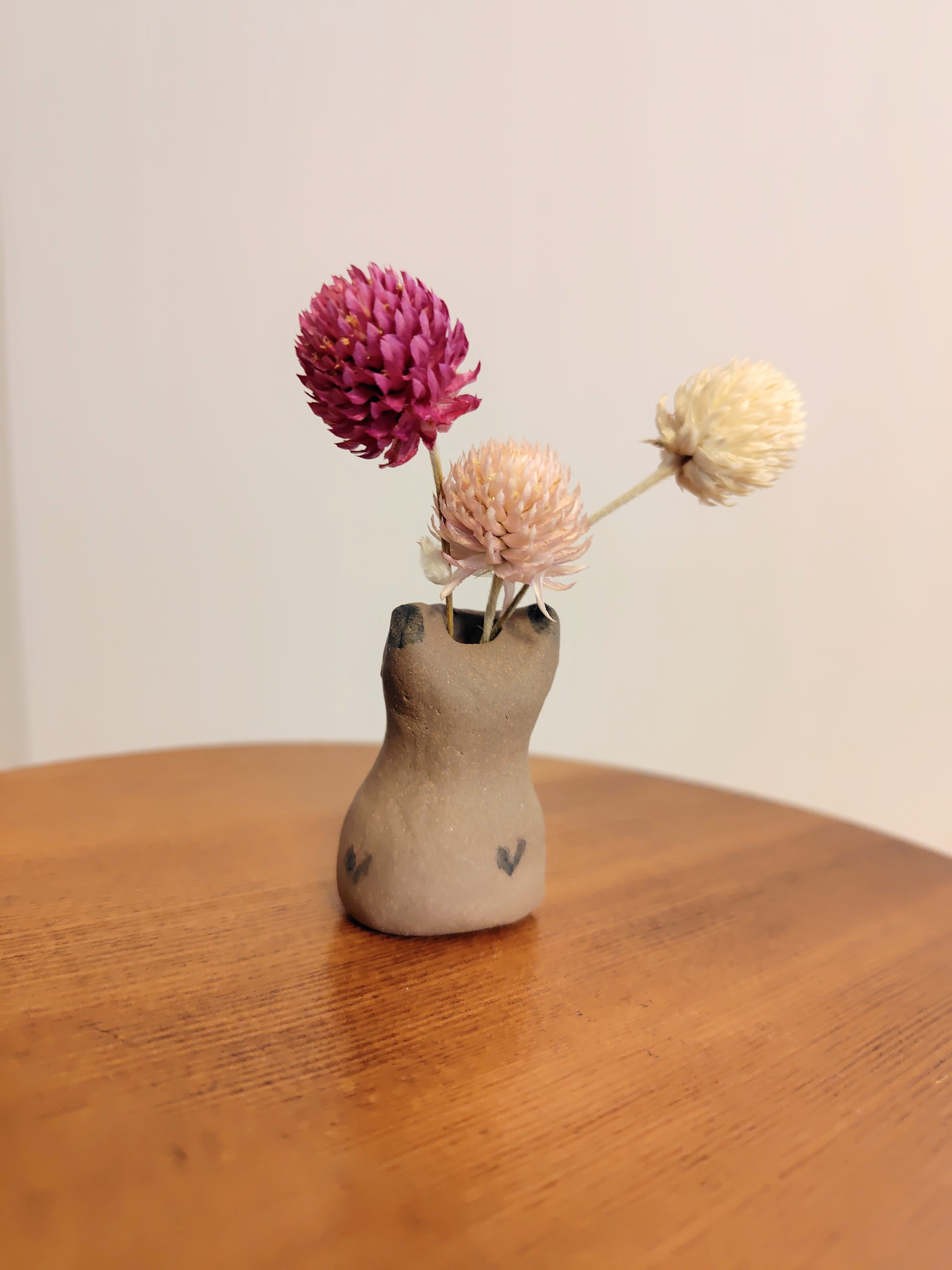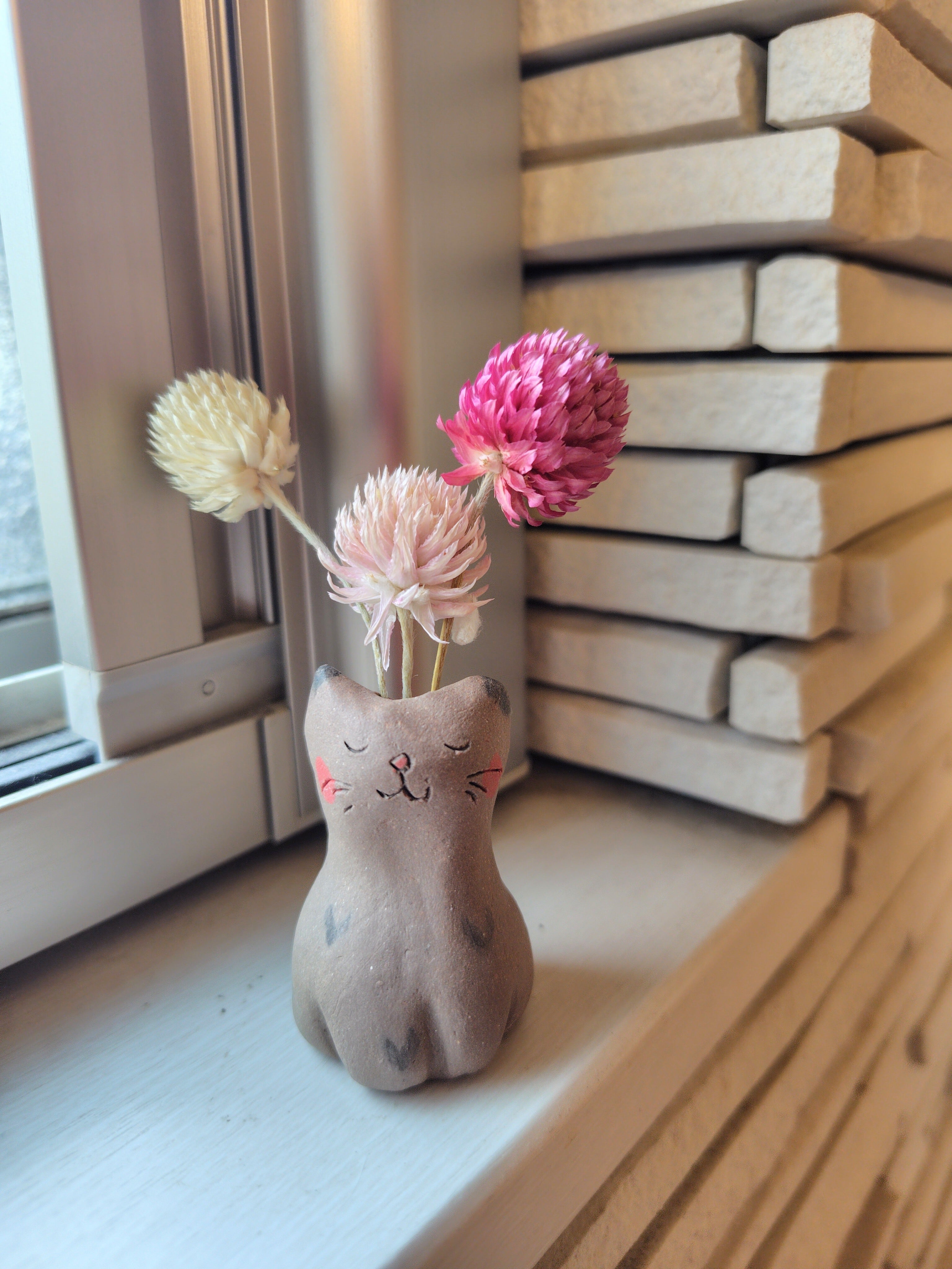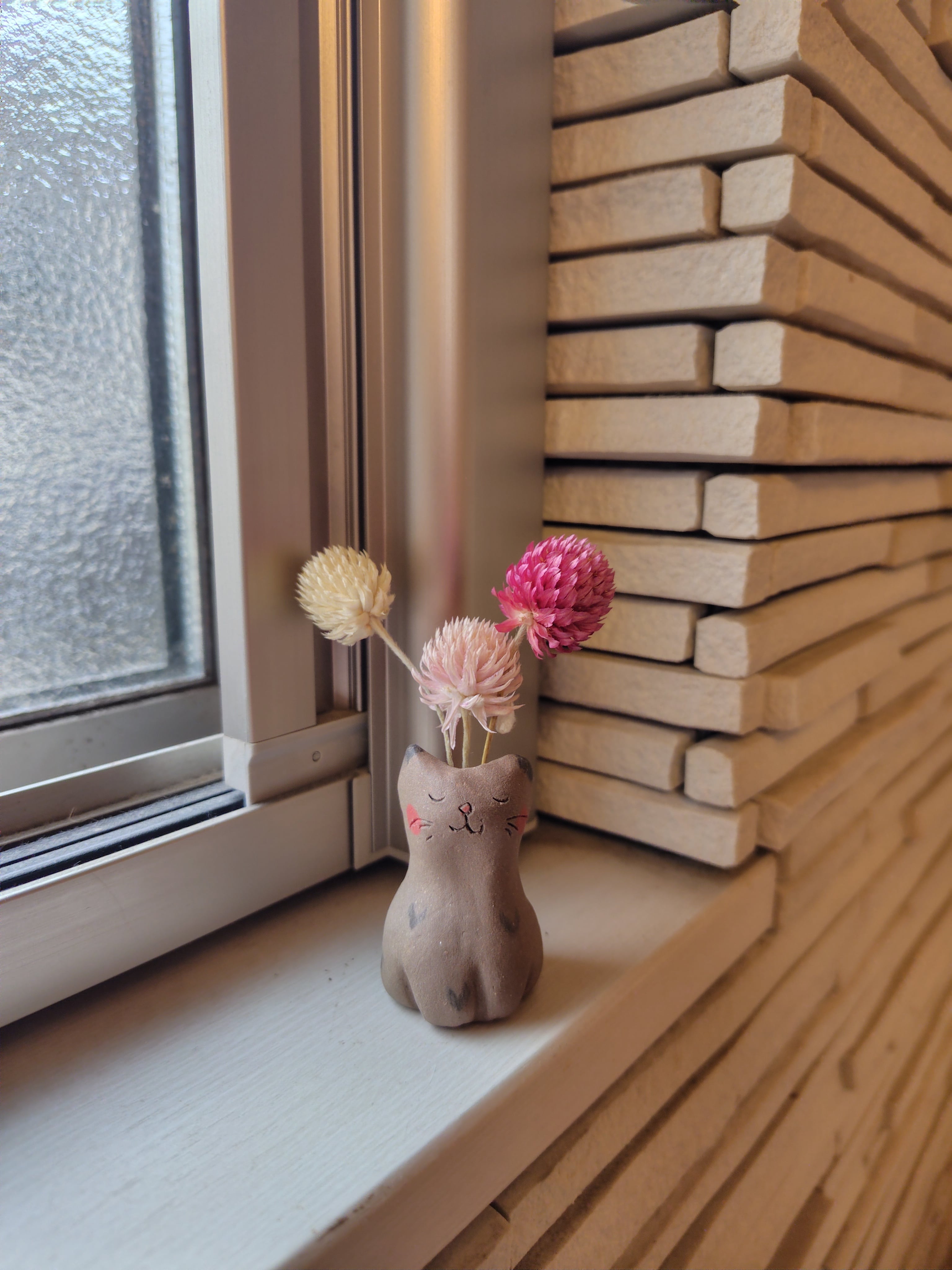 高さ約5センチセンチという絶妙なサイズ感で、ドライフラワーや、生花をお水を入れて飾る事もできます。お香立てとして使ったり、縁起物のねこちゃんのお髭入れとして使って楽しむこともできて、使い方は自由^_^ 可愛らしい姿を見るたびに、心が和むことでしょう!