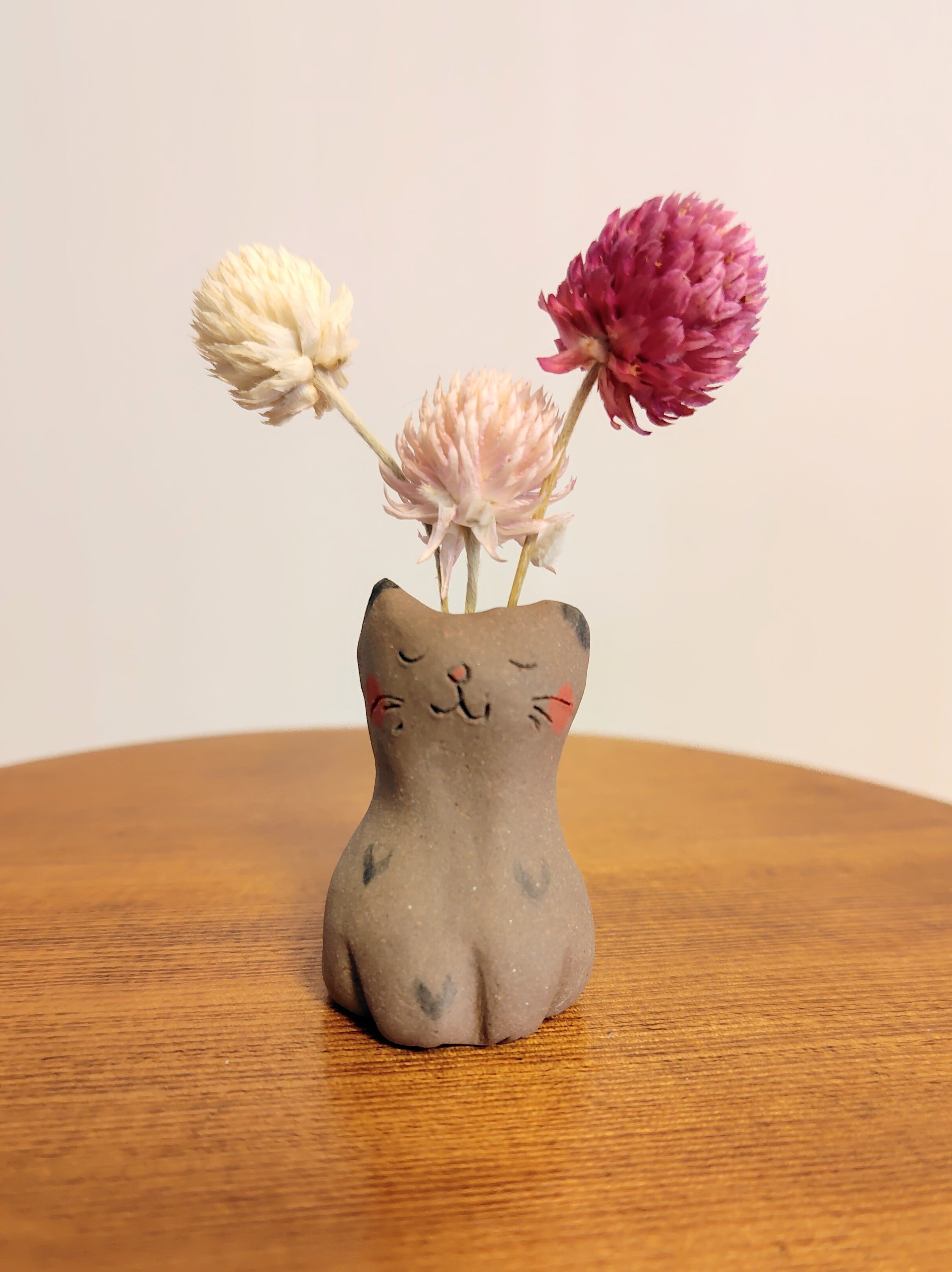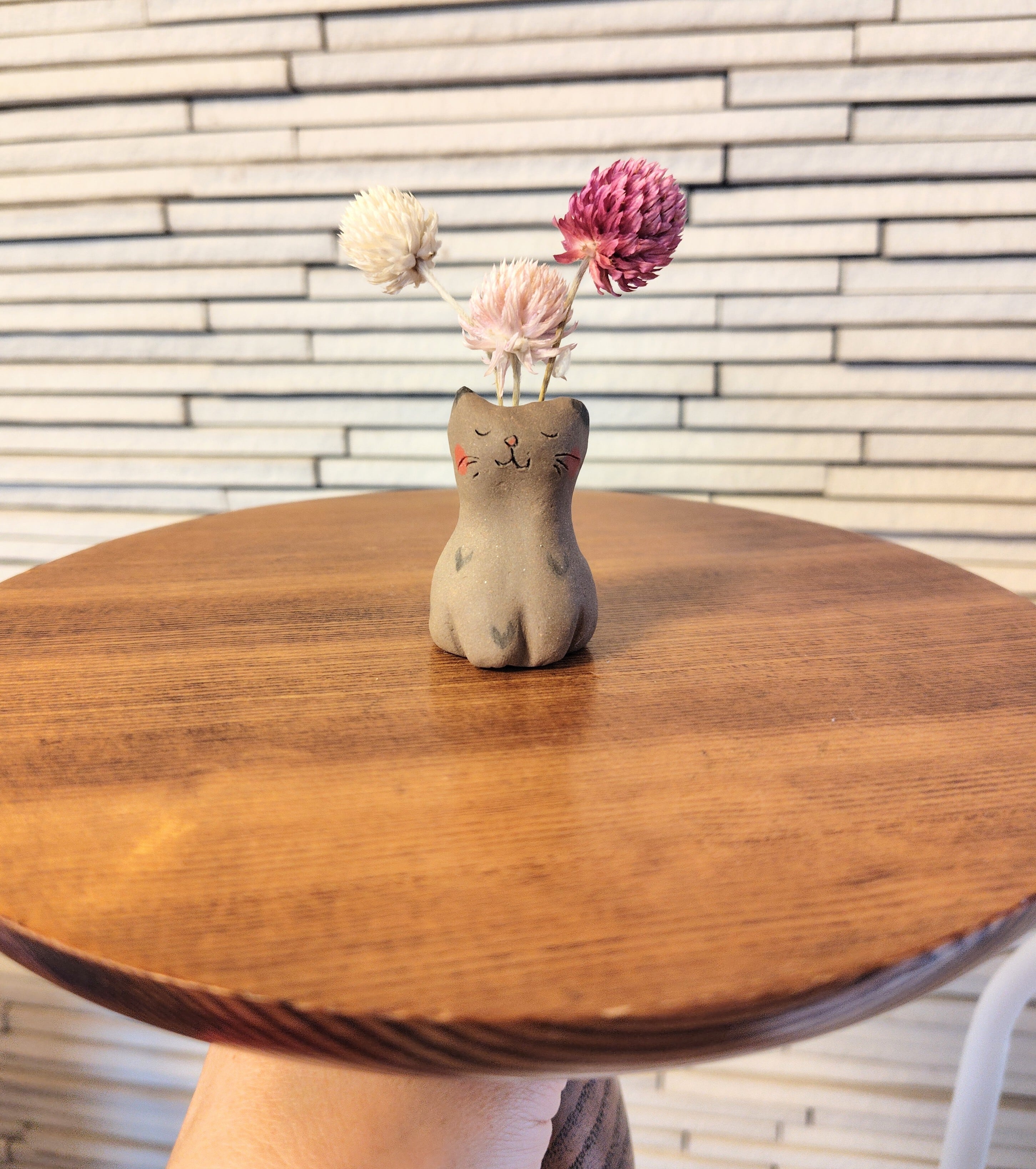 心温まるこの猫花瓶は、大切な人への贈り物にも最適です!お花を愛する方や猫好きな方にも、ぴったりです。独特の手仕事による1点物として、相手の心に残る特別なギフトとして、ぜひご提案ください!!