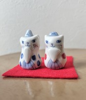 高さ3.5センチの猫のお雛様。有田の磁器の土から制作、窯で2回焼成した手作りの一点ものです。ねこちゃんの優しい表情と、鮮やかなドット柄でモダンなお着物のペア猫ちゃんです