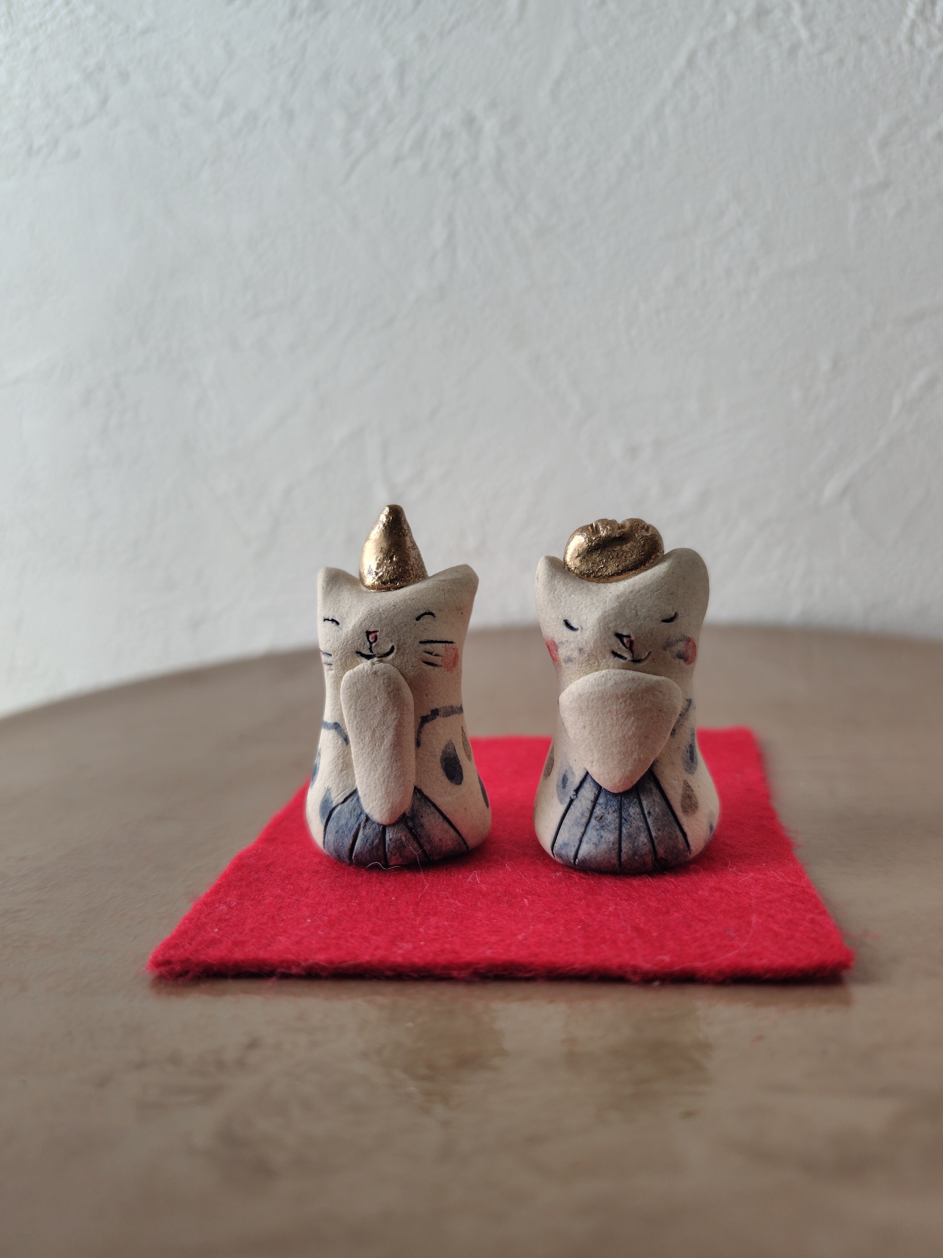 高さ約4センチの猫のお雛様。信楽の陶土から制作、窯で2回焼成した手作りの一点ものです。信楽の土のクリーム色と、金の漆、呉須の藍色の濃淡で表現したお雛様です
