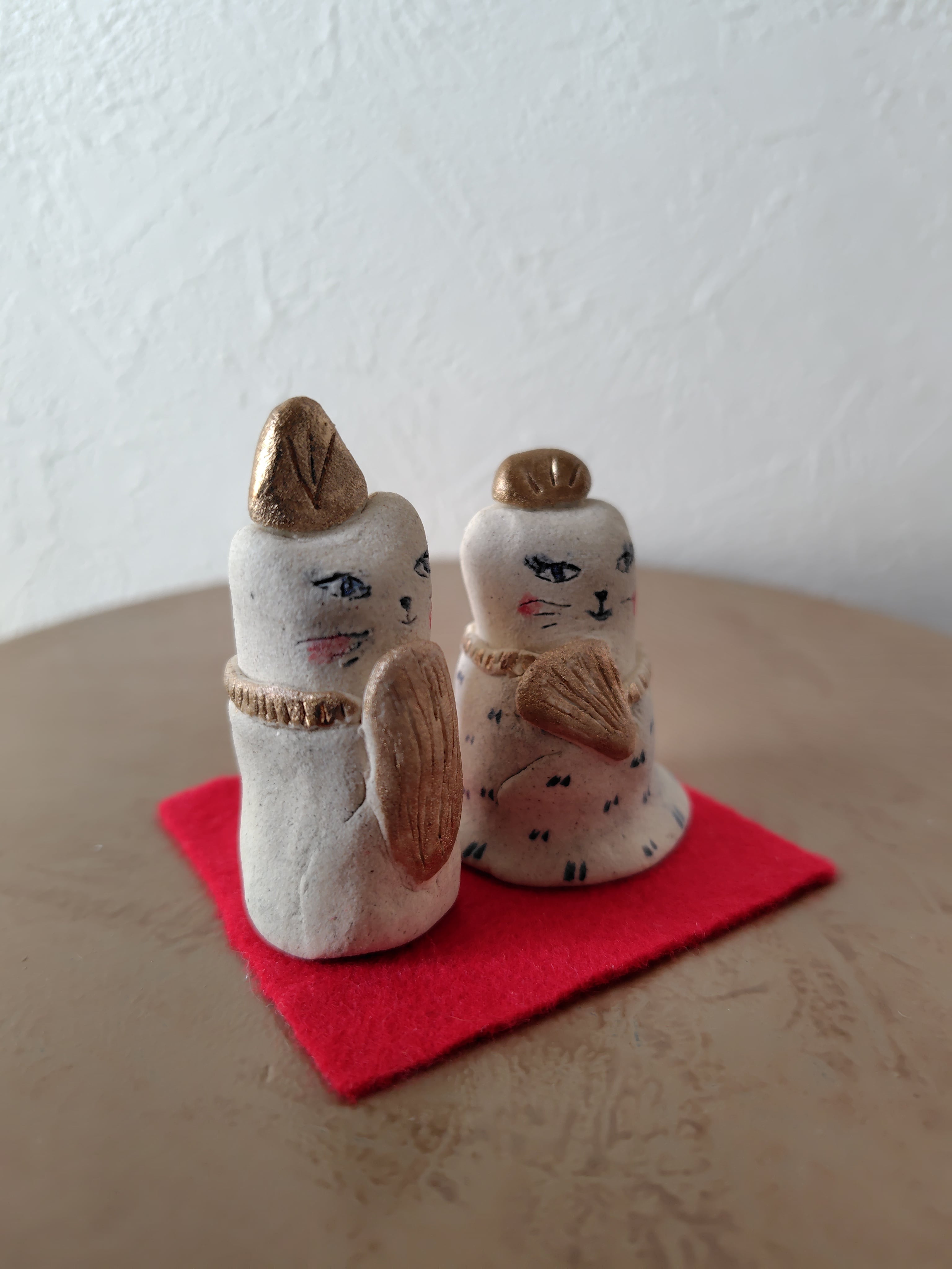 一番大きなサイズ高さ約5.5センチの猫のお雛様。信楽の陶土から制作、窯で2回焼成した手作りの一点ものです。信楽の土のクリーム色と、金の漆、呉須の藍色の濃淡で表現したお雛様です。釉薬をかけずに焼締めているので、ザラっとしたツチの風合い。